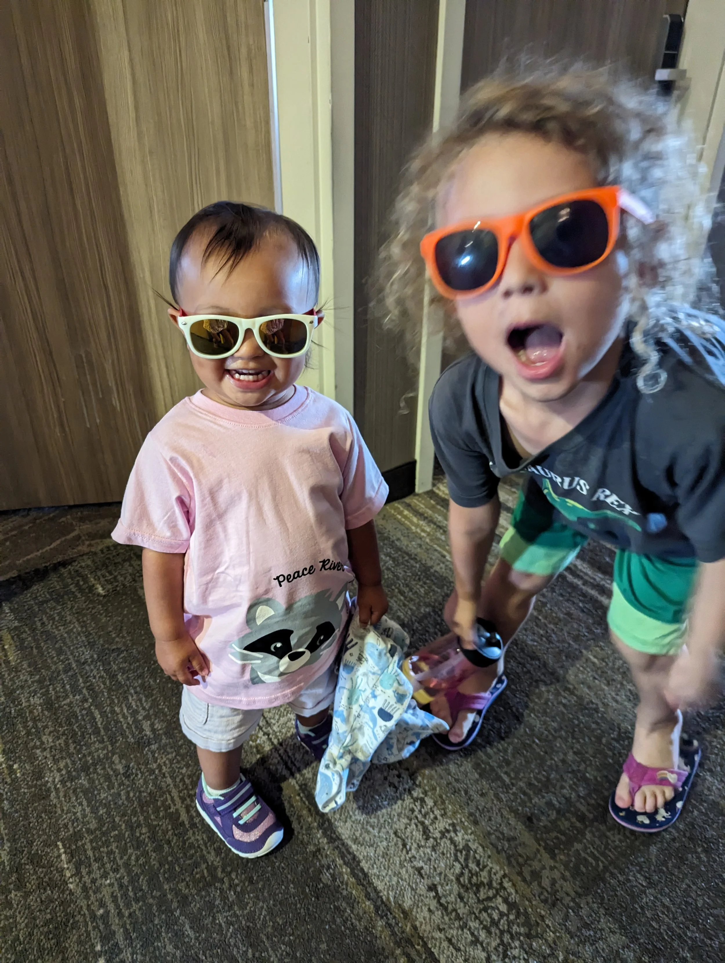 The Swimming party at Barb and Skip’s was a success, with both kids having a ball jumping in. Tristan learned how to balance and use the pool noodle so he and I played cowboys on our horses aka pool noodle. Jasnah enjoyed the play watering can and splashing. GG and Jacqui brought oatmeal chocolate chip cookies that GG made, which were a big hit at lunch. After lunch, we went to see the neighbor's donkeys and feed them apples. Wanted to see the chickens but could not find them. Barb gave Tristan a ride on the tractor and even let him drive a short bit. I didn't get my usual walk with Barb; everyone went back to the hotel or GGs for a rest before dinner.