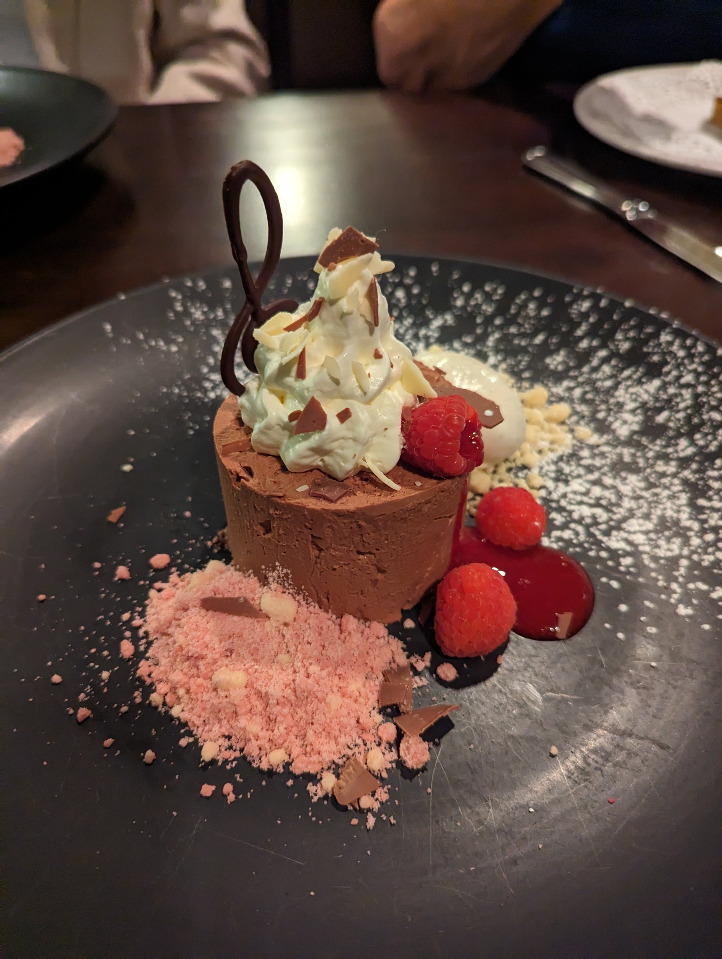 Mom had rice pudding for dinner and Laz and I opted for the dark chocolate mousse. Another gorgeous presentation. The crunchy raspberry and vanilla cookie crumbles were a perfect accompaniment.