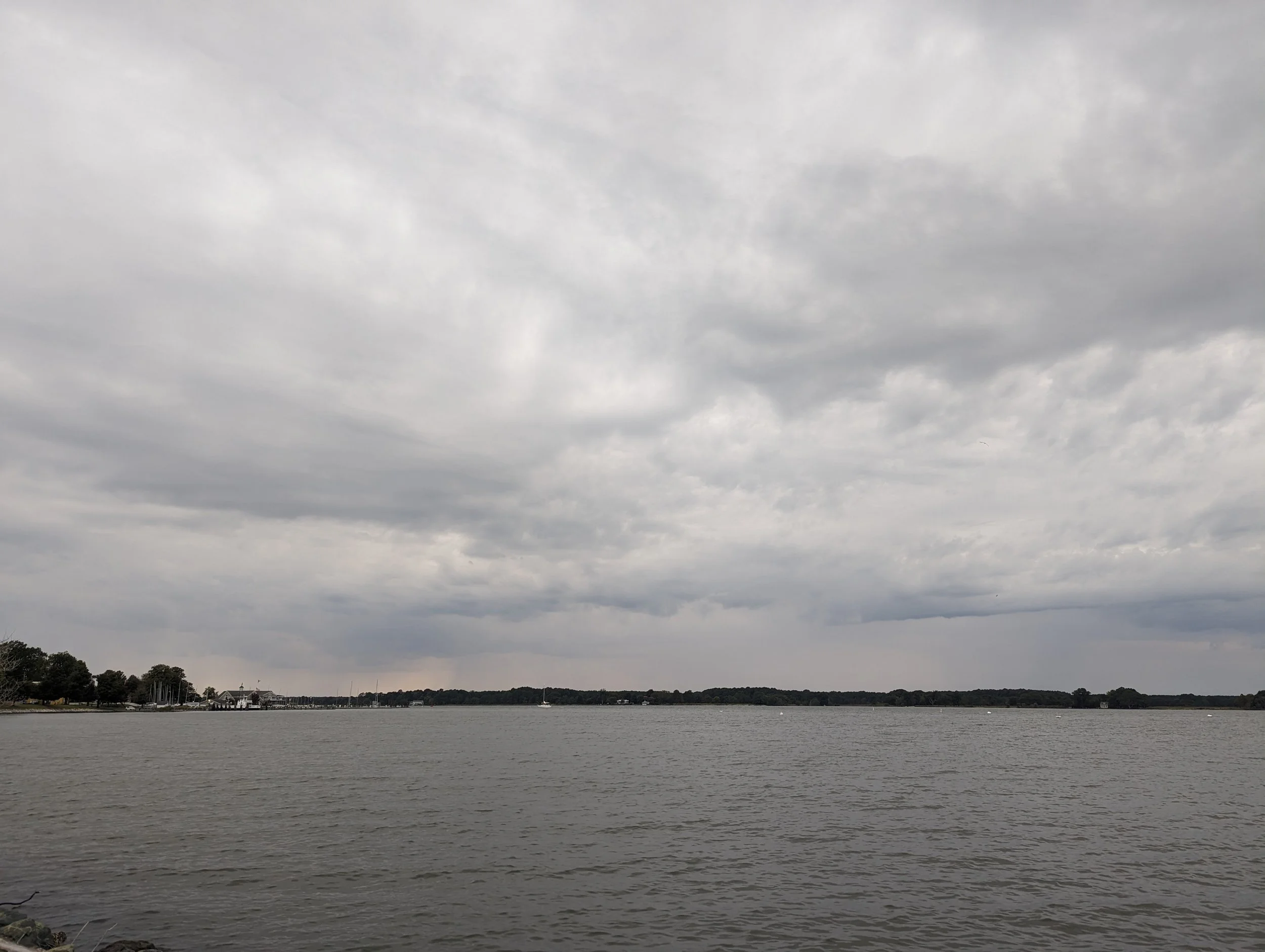 A small glow behind the rain coming down over Cambridge. The yacht club is in the left