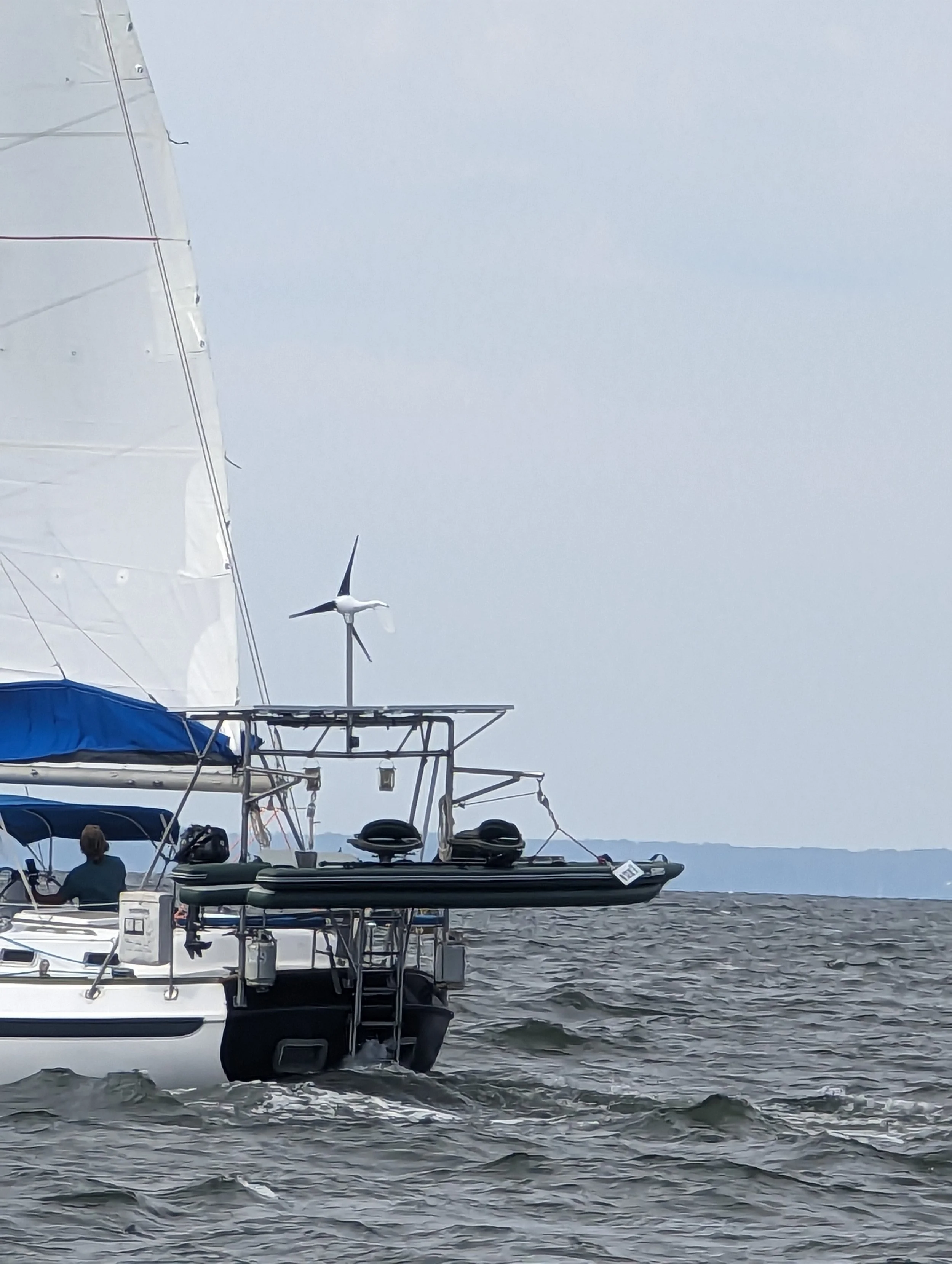 Great wind today from the N, NNW. With 13-16kts we were able to sail with the code-0. Lots of sailboats out, which was great to see. Also saw some of a regatta that the Navy sailboats were competing in, all with spinnakers out like the one we saw in Annapolis. Wind was strong enough, with waves from behind that Boji swamped and the port D ring came off with the fabric tearing. Laz put the tether on the center and starboard D rings and tied her close. The center D ring fabric has a small tear as well but luckily did not give way.