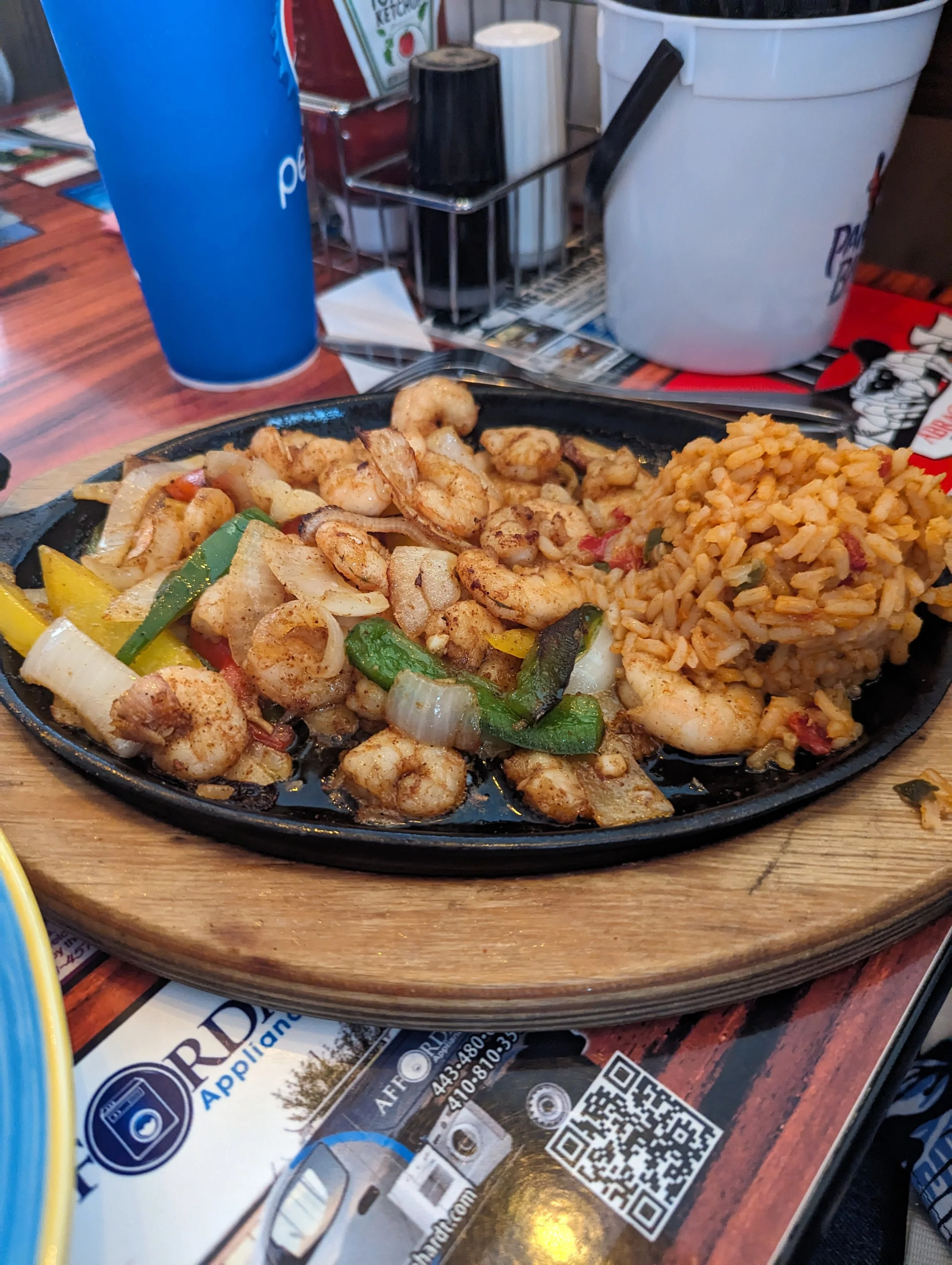 Laz had the shrimp fajitas. Great to catch up with friends over dinner. Next time we will meet at Schafer's, closer for them as well as they live in Middletown DE. Have not decided where we are going tomorrow.