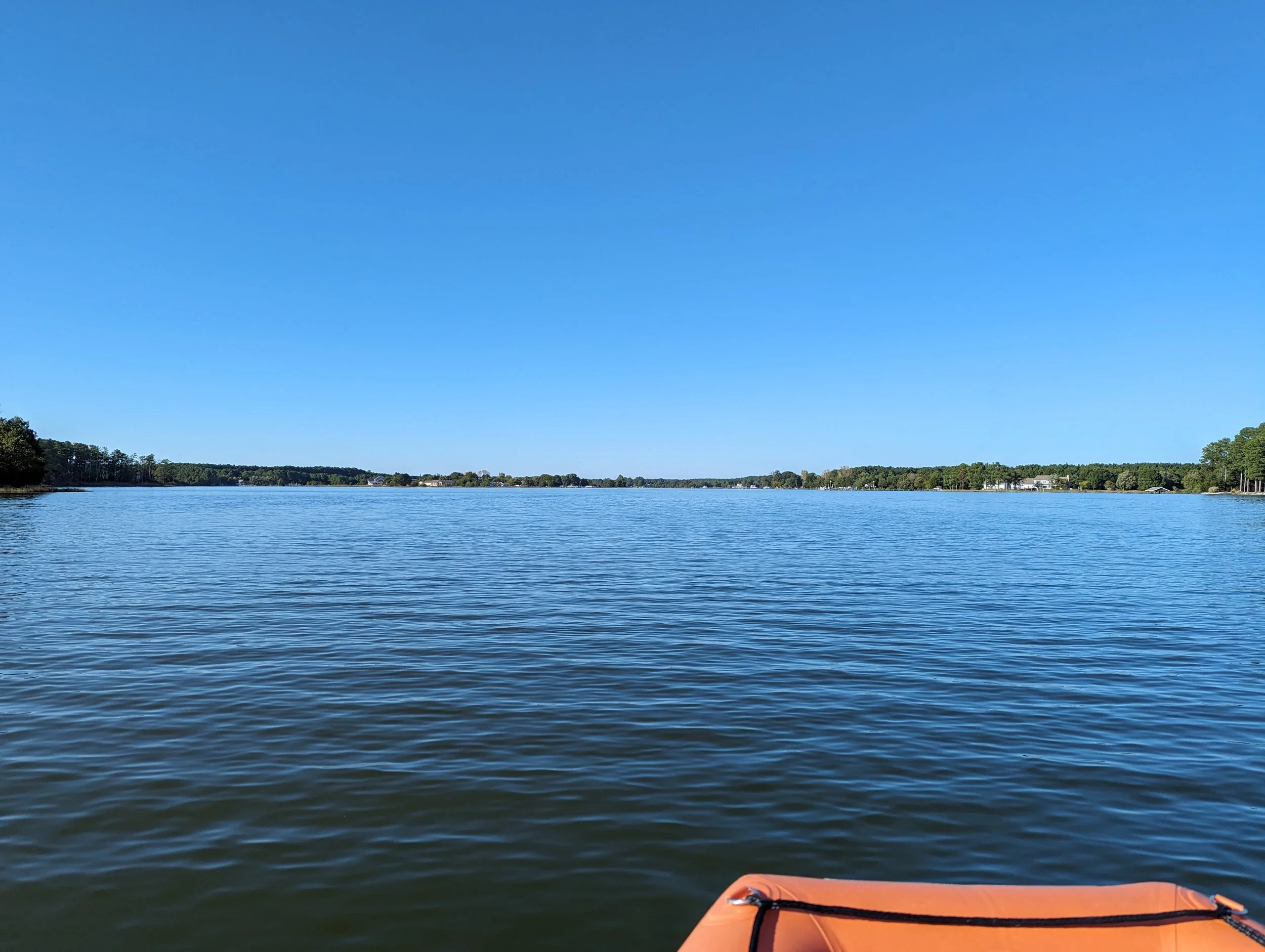 Tricky to selfie and smile while going full out in breeze, but no one was hurt in this endeavor. And the cell phone remained in board. Decided to anchor in Eastern Bay. Had a couple of choices but the first was too wide open, so we settled on Shipping Creek, a small snug creek with homes and docks all around.