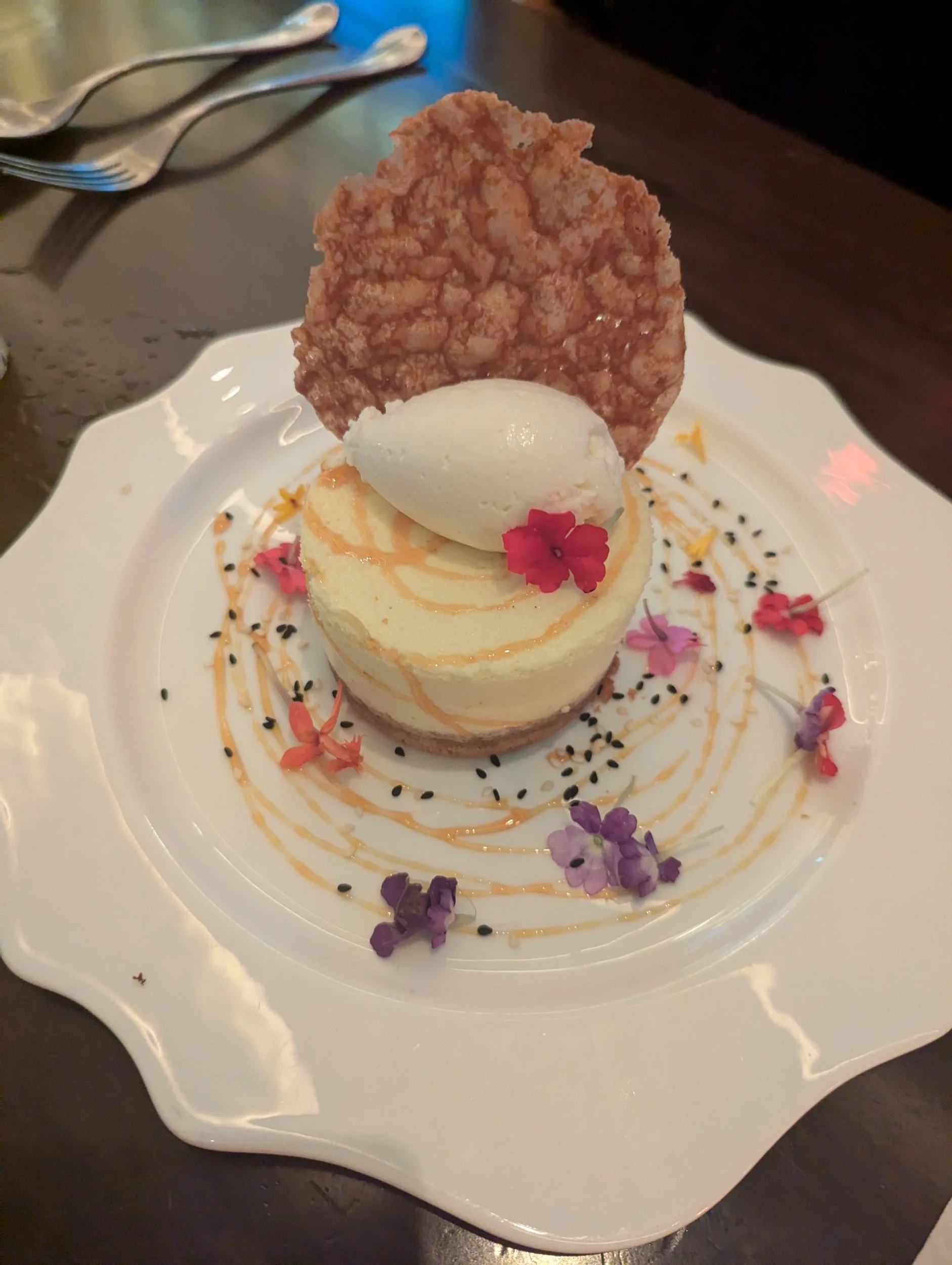Todd's cheesecake was beautifully presented, and apparently tasty as well. Good thing Bailey wanted a bit of a walk after dinner. Tomorrow we are doing more touristy things.
