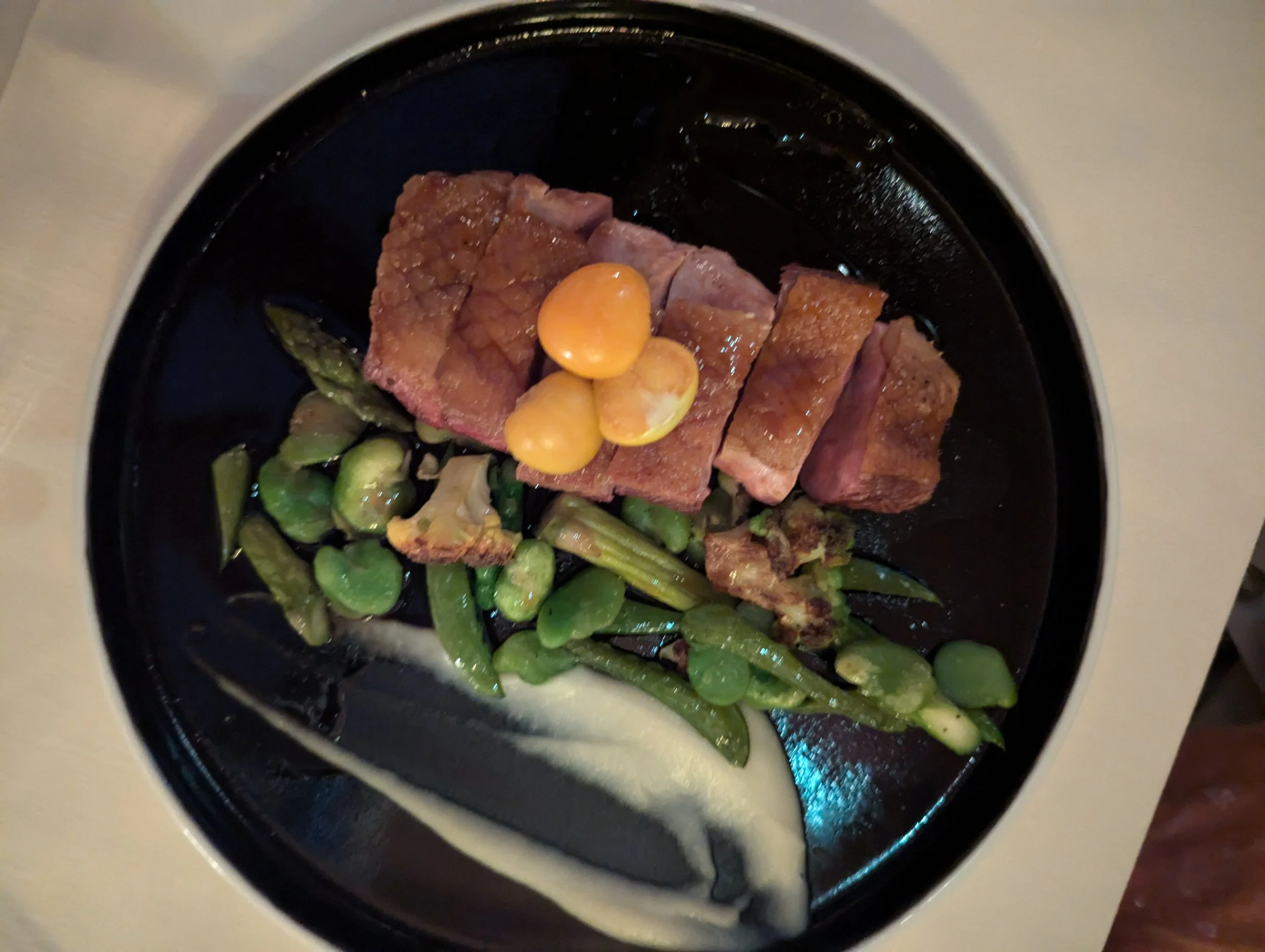 I wanted the Rockfish Basquaise, but unfortunately the preparation had alcohol. They were able to prepare it a la Halibut style, with crispy potato crust atop. Delicious!