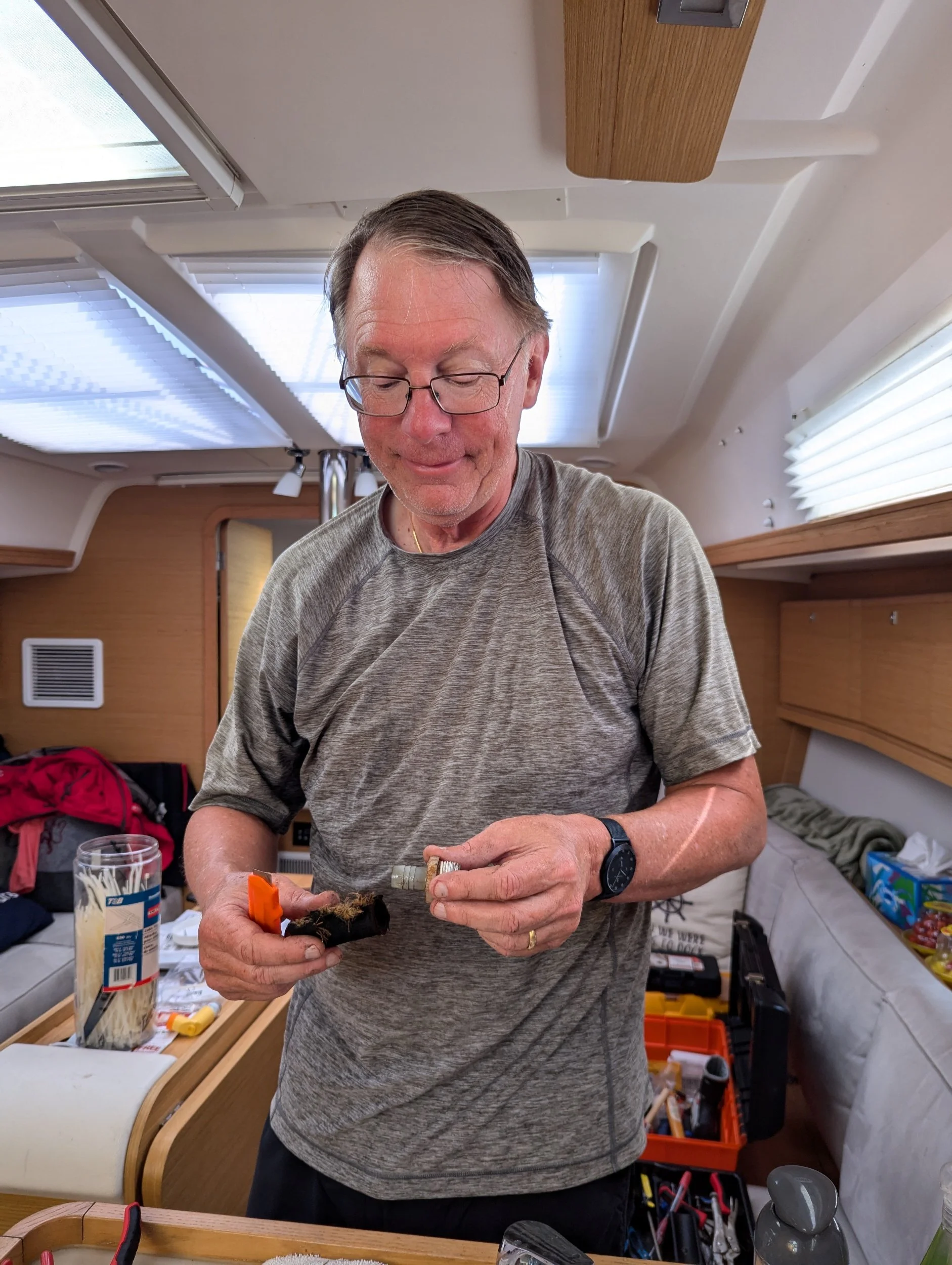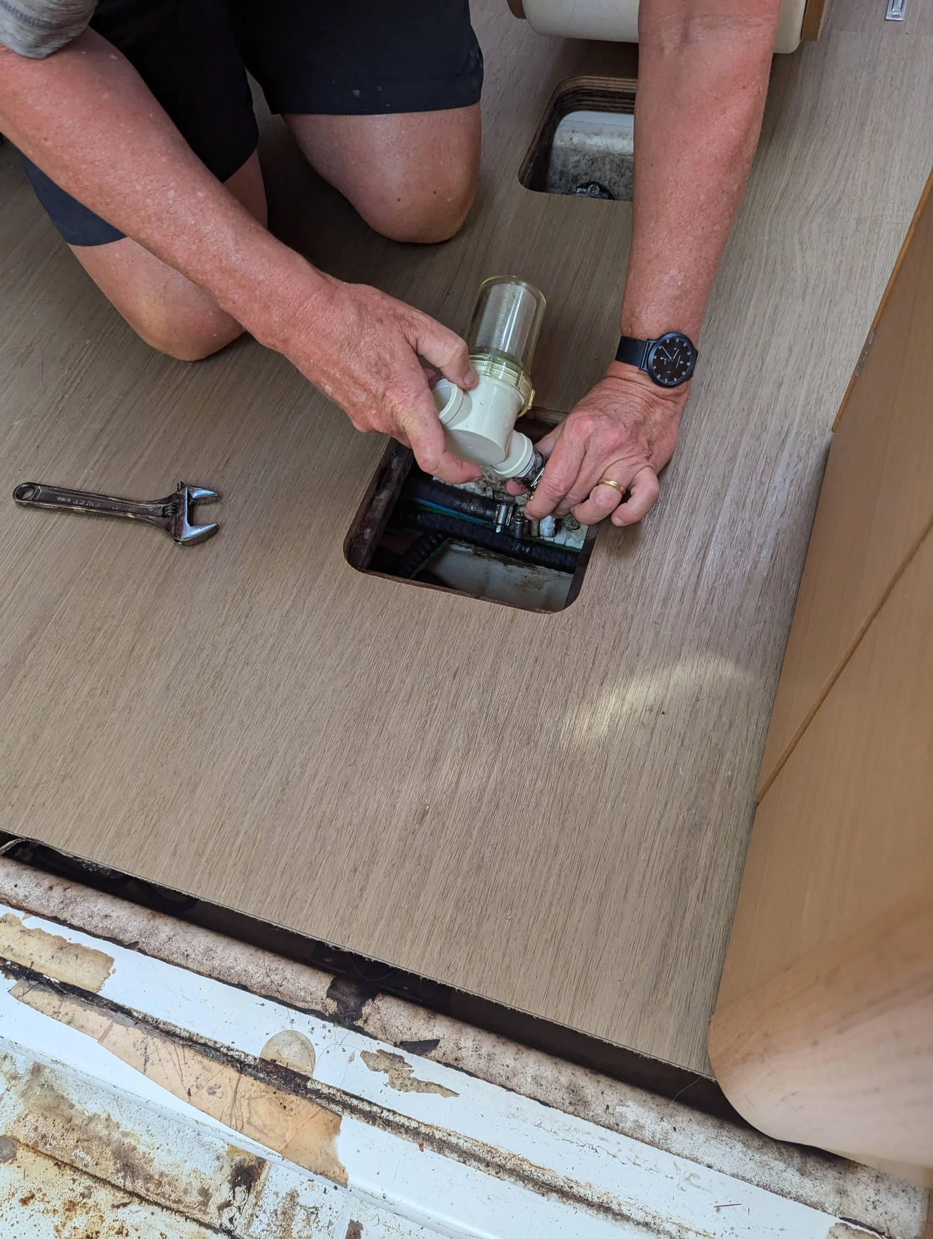 We set to work replacing the AC sea strainer/ water filter. We had to lift and reposition the floor, after removing the wine rack, and wine rack door, in order to get better access. Laz could get one side of the new strainer screwed in, but the other was a challenge because there was no room to turn it, or use a wrench to help turn it. We cut the hose, thinking we could get the barb with the threads off, put that piece on the new strainer and then reconnect. The hose proved difficult to cut as there was a metal wire running through it. Wire snips helped. Laz had to cut the hose to get the barb out, and then we could proceed. Once connected, we put the wine rack back together, including the door.