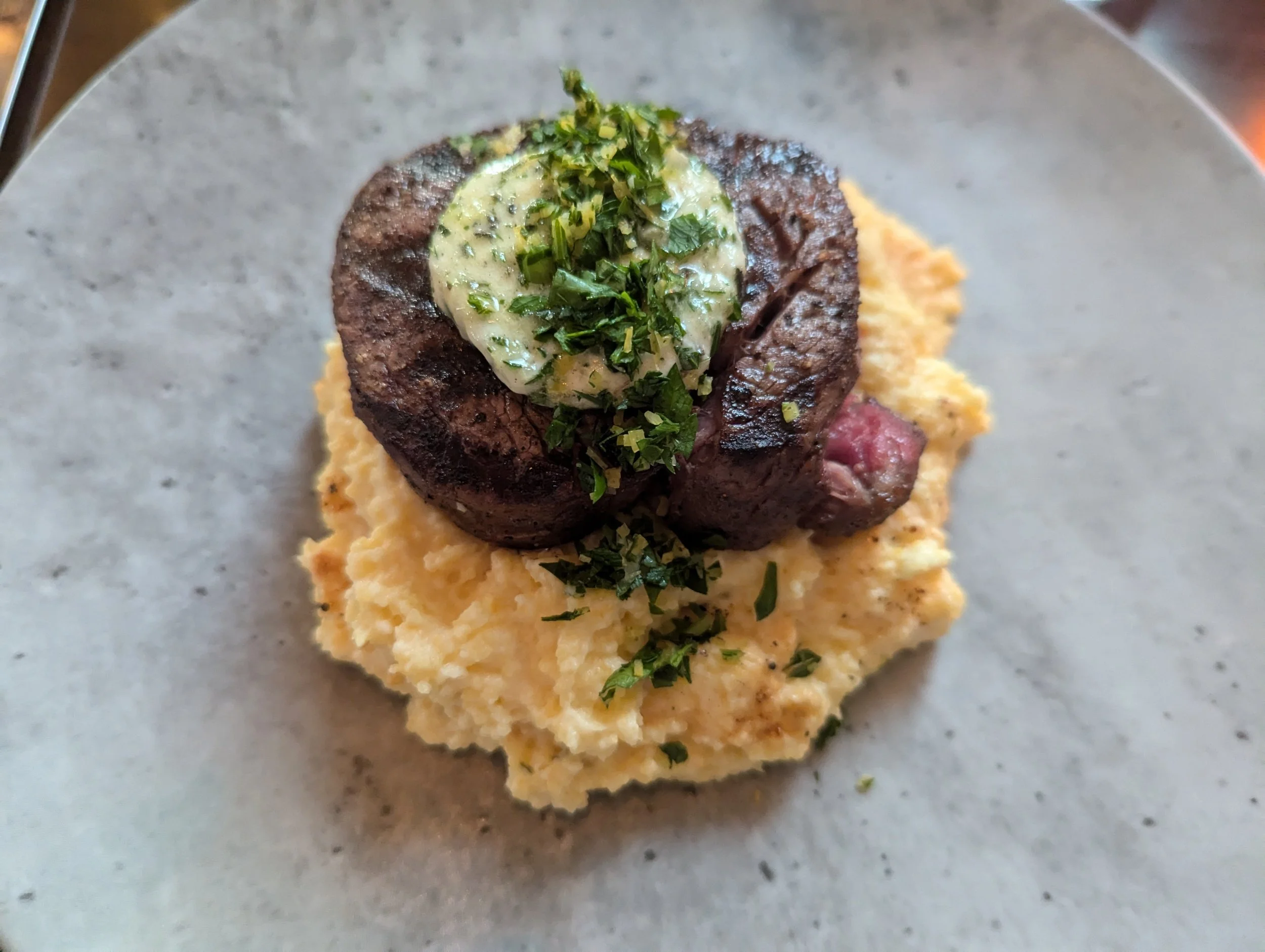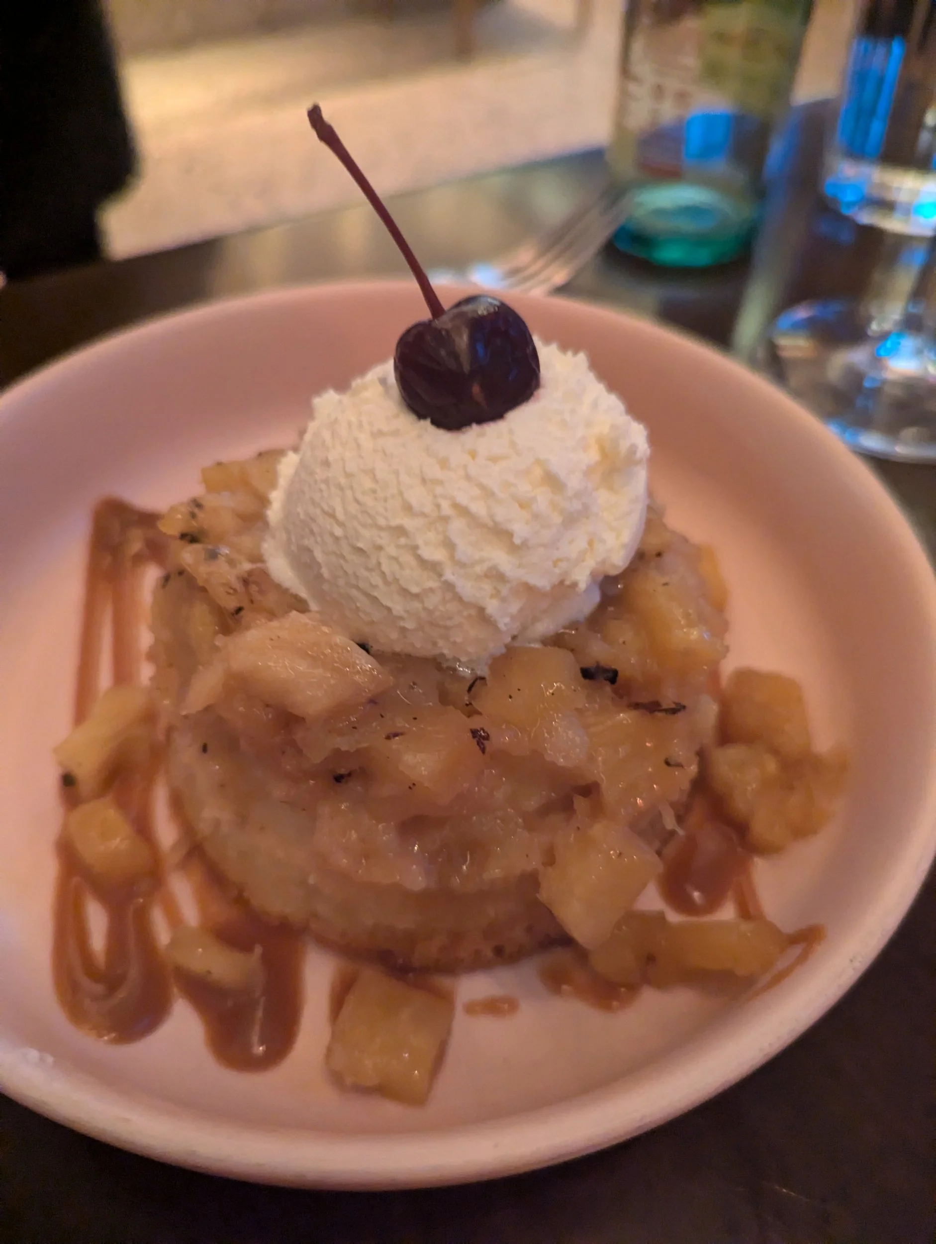 I had the restaurant week menu of Caesar salad with anchovies, petite filet over cheesy polenta, and a petite flourless chocolate cake. They initially brought one with a wine sauce and they remade it without. Laz had sirloin steak and pineapple upside down cake. Todd had ribs, Debbie had 1/2 chicken. All meals excellent with plenty leftover for home and future lunches.