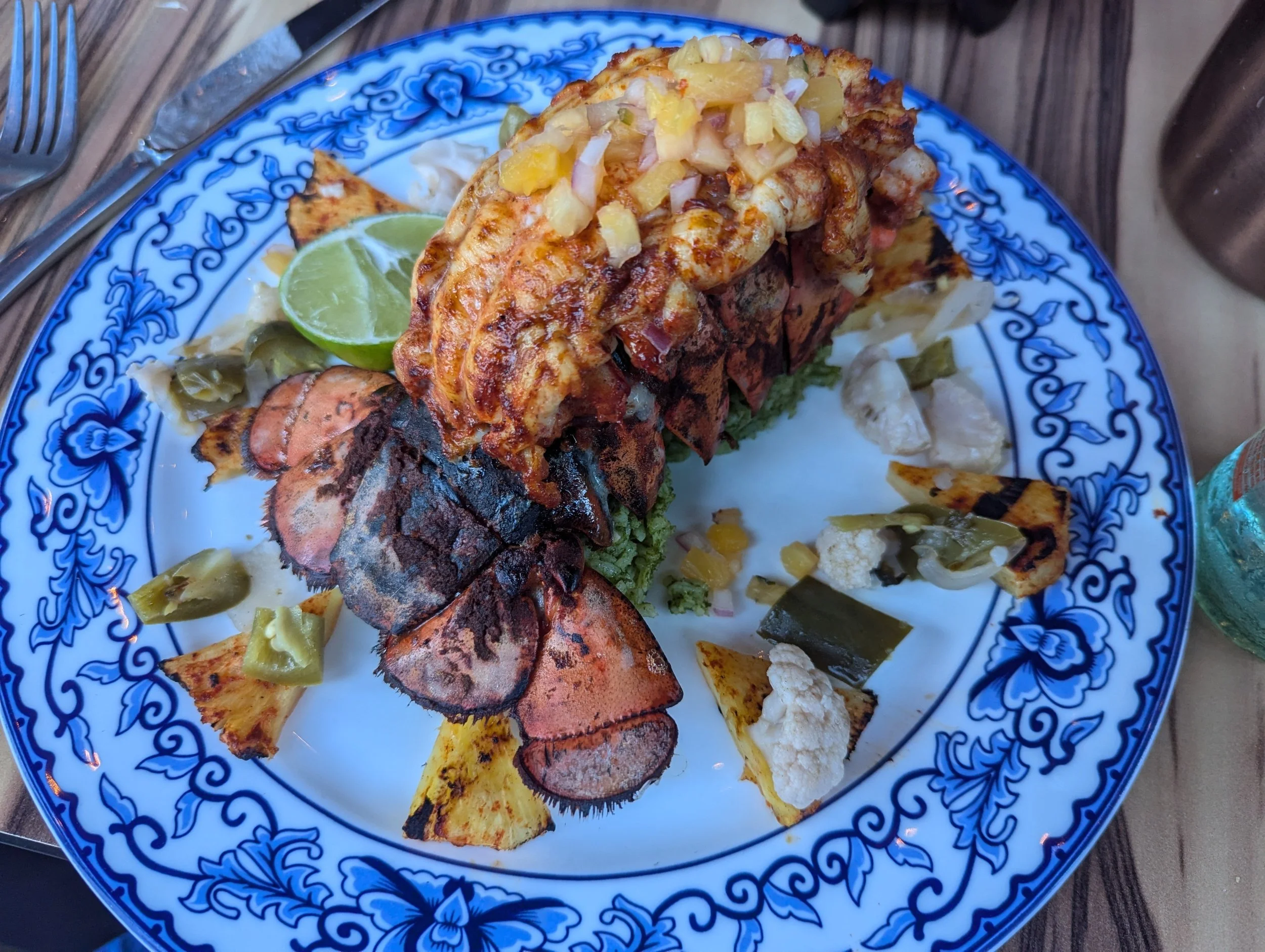 Debbie and I both had an excellent lobster dish, Langosta al pastor, with grilled pineapple and great spices.