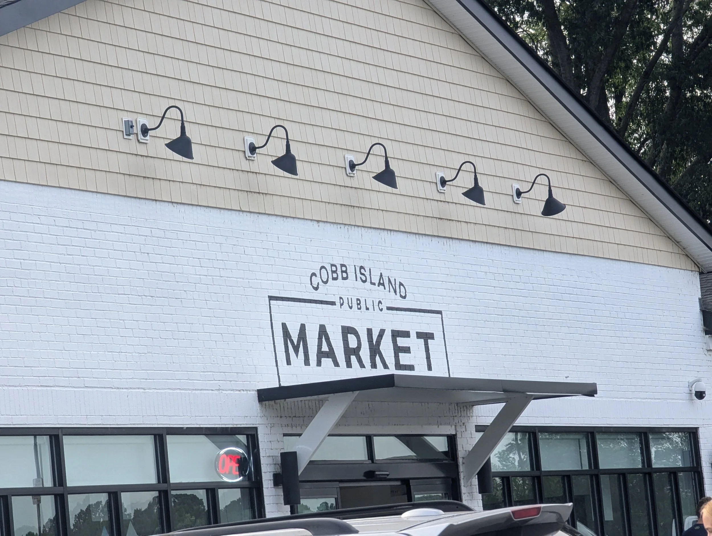 We hoofed up the short hill and across the street to the Cobb Island Market for OJ, eggs, chive cream cheese. It's a nice market with a good quality selection of things.