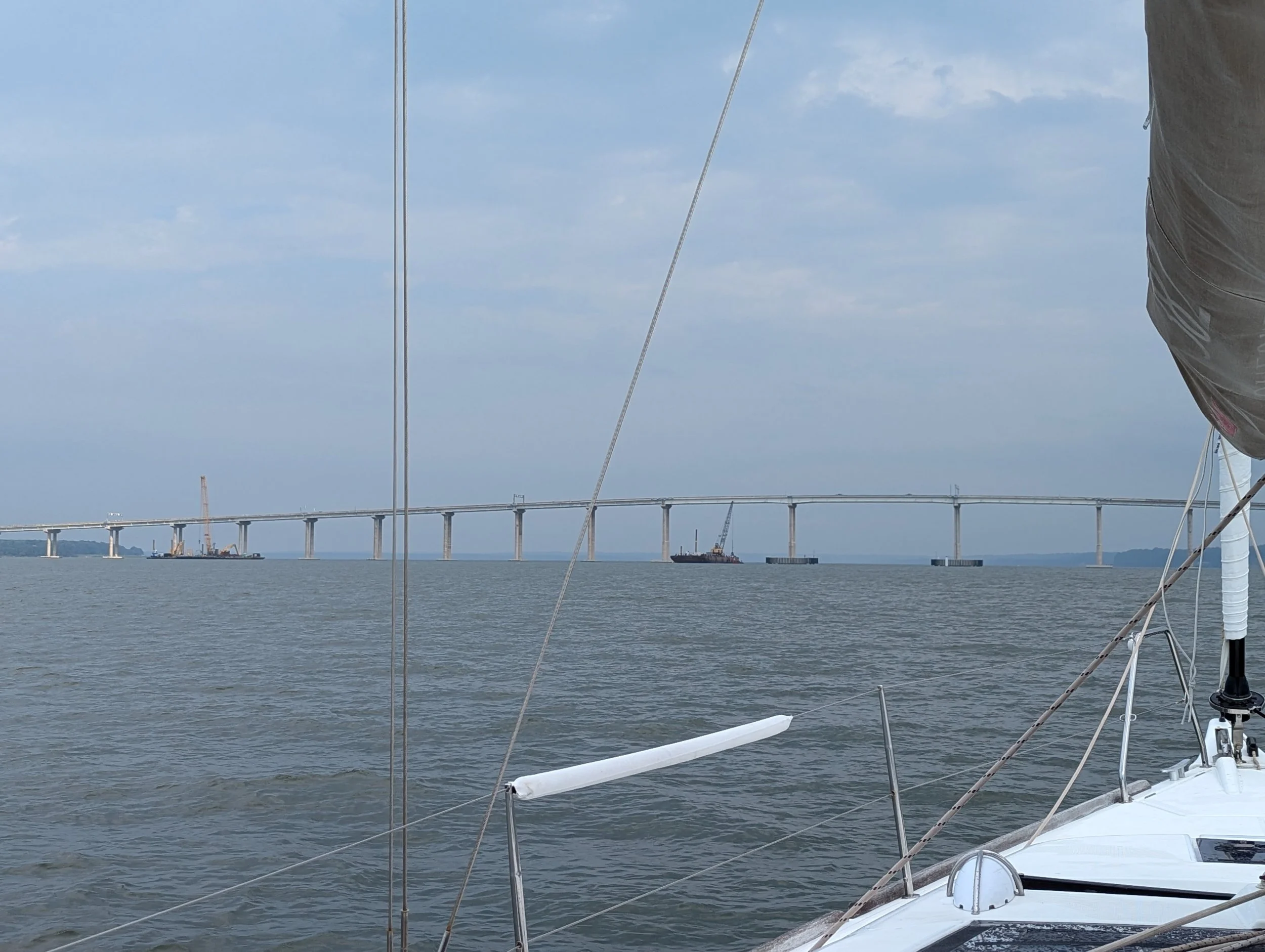 We did not get a hail from them but we did see up to 4 lined up out there. The wind was behind us, and down to 3 kts after we rounded Mathias Point Neck so we furled the jib and put the motor on. There was a lot of interesting activity under the bridge. We couldn't figure out what the barges were doing. The crane was dropping a cylindrical weight in the water then hauling it back up again. An odd dredging. After we got under the bridge, we had a nice exchange with Range Control 2 from Dahlgren. He told us to keep close to 30 and 32, which we were happy to do. He hailed again to clarify that the rest of the river was ours, which was sweet. The wind picked up and we put up the code zero and had a lovely sail down the Potomac. Did a little gybe tacking and sailed all the way into Canoe Neck Creek off St. Clements Bay.