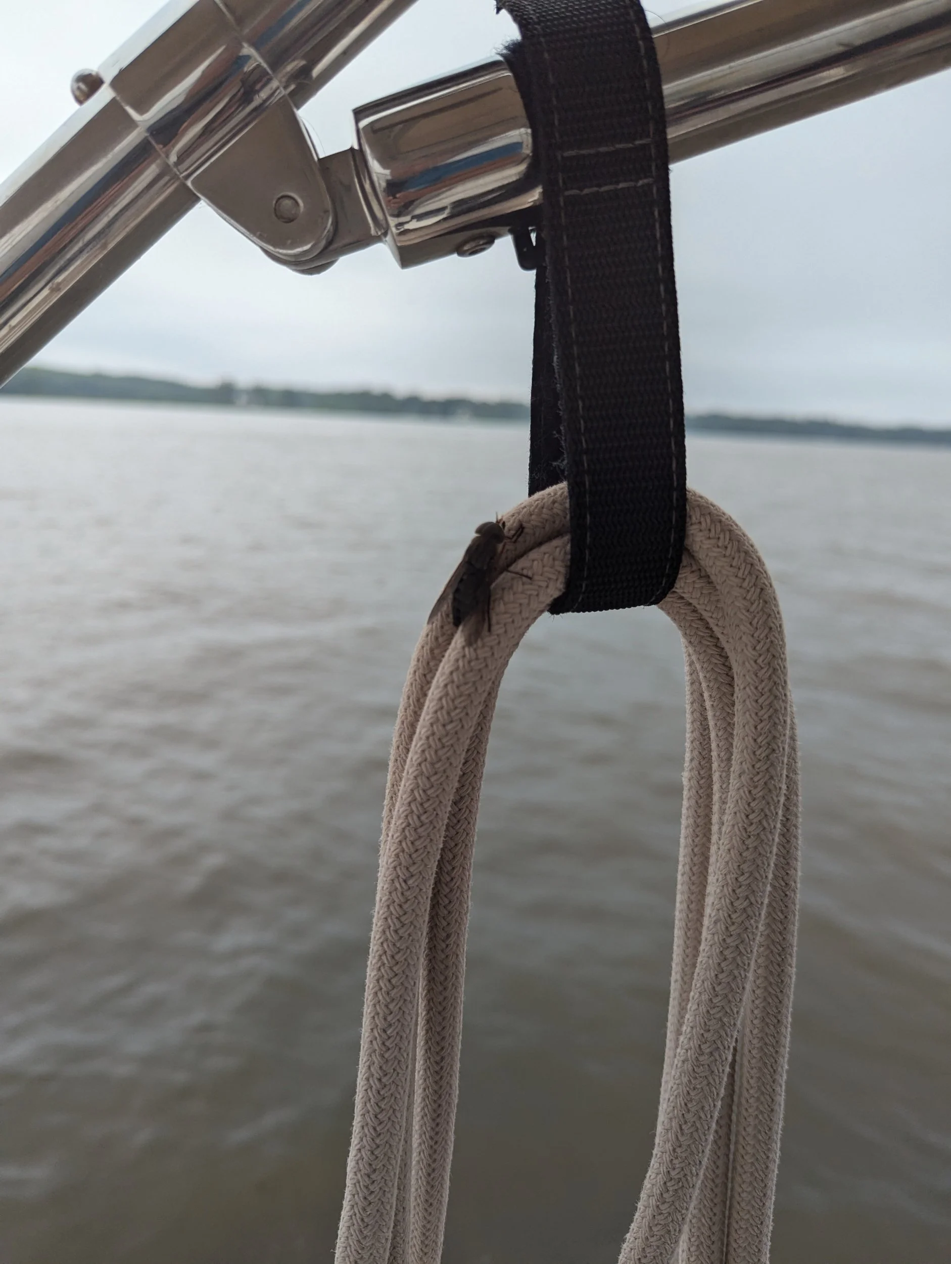 The day started off chilly, with light rain, so I grabbed my foul weather pants and my waterproof Exeter coat, which kept me warm and dry. We could see the rain over Colonial Beach and all around us. Cushions stowed below when it hit us. Rained on and off, but not much wind.