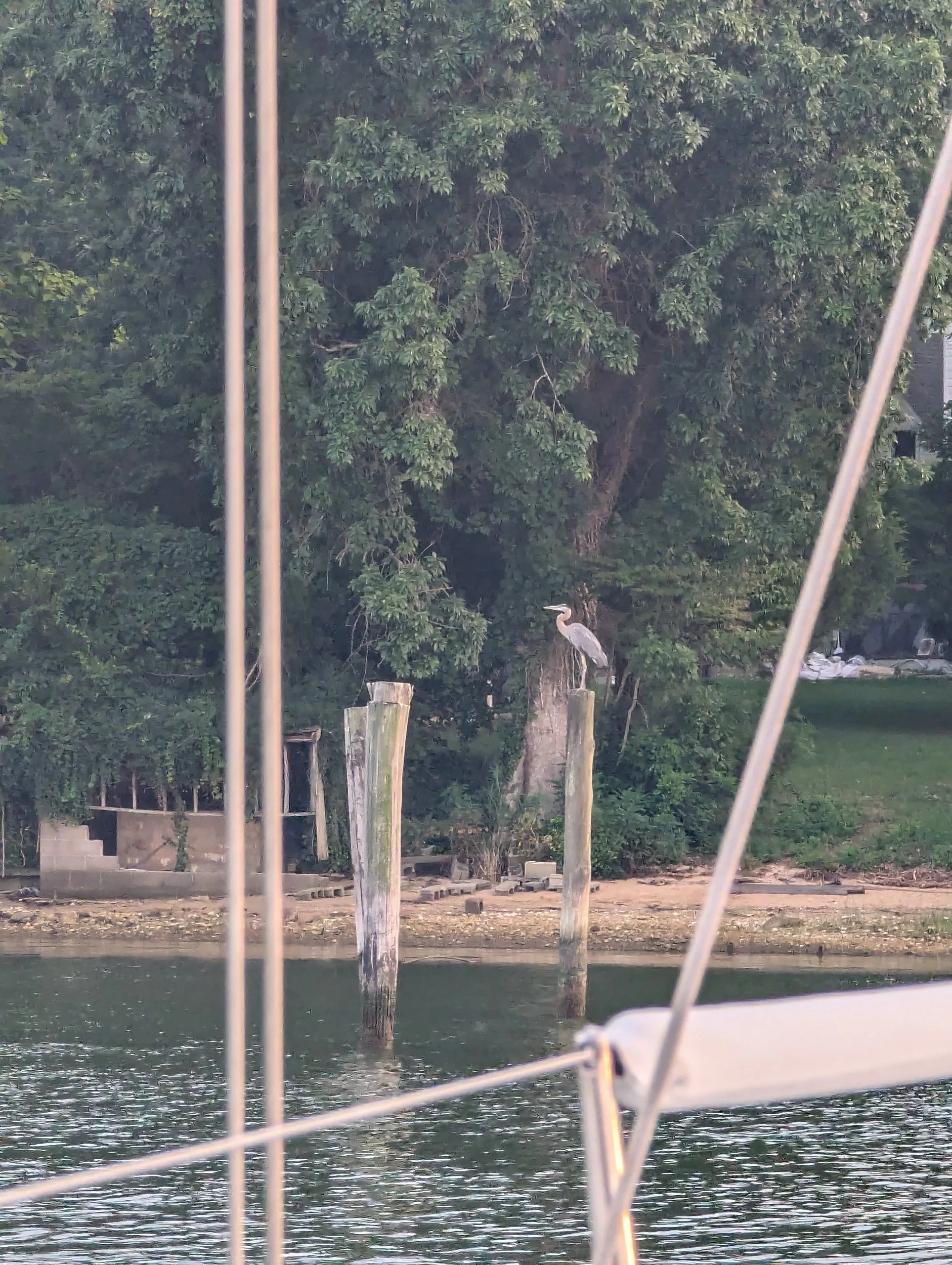 Up anchor and away by 0800. Lots of seagrass on the anchor line and chain. Served breakfast in the cockpit, heated up a morning bun from Mason St. bakery and the Wildgrain English muffin. Motored until near Maryland Point, then put up the sails. We had the tide with us up to 2 kts. Great wind from 5 to 13kts, at one point we were a sustained 7+ kts over water with 8+ over land. A lot of wheee! Wind was behind us and down to 3 kts as we rounded Mathias Point Neck so we furled the jib and put the motor on.