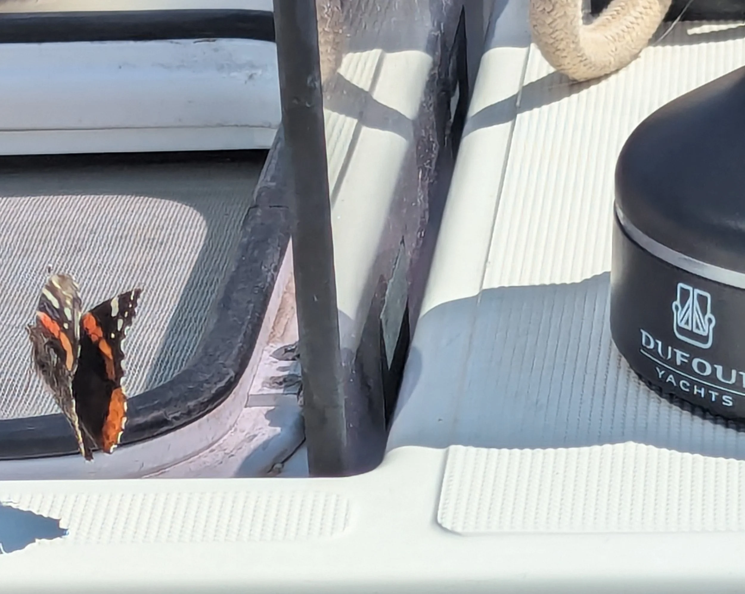 There were some cool needlefish swimming in one of the empty slips. The light was just right to capture them. Laz went off in search of a soldering iron to try to fix the bow windlass control. I put the main away by myself, on tippy toes, and put the bimini in full coverage position due to the sun. Put on the AC and it started beautifully without a hiccup. Unfortunately the soldering iron was not what Laz needed, so the bow control for the windlass remains unfixed. Soul Mates pulled into Jutland and anchored between the marinas. They dinghied over and came to say hi. I showed them around the marina and we agreed to have dinner together at Salt Kitchen at 1830. Laz washed the anchor, with my help to raise it. Refilled the aft water tank and switched tanks to use.