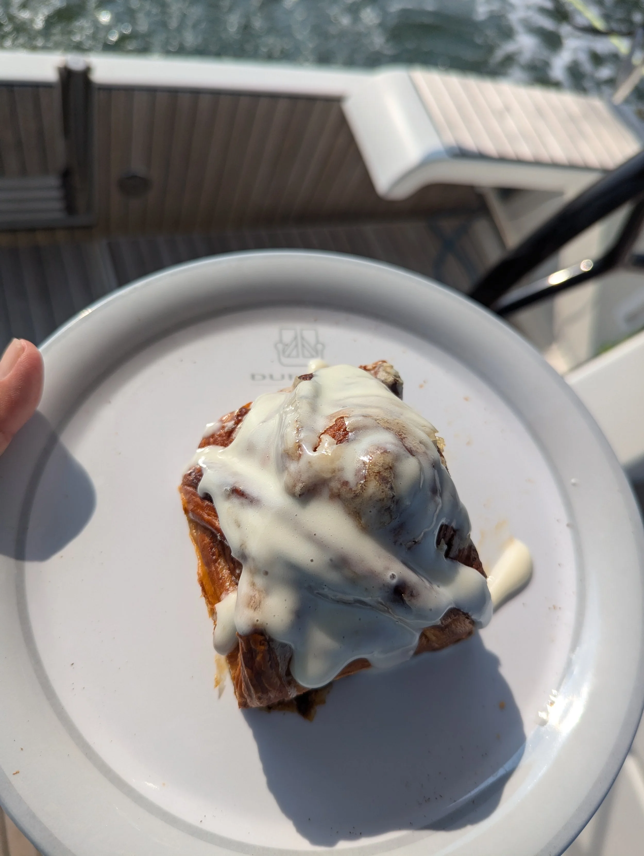 Bistro Du Jour's cinnamon bun with cream cheese icing for breakfast as well as yogurt and coffee, served as we motored out of Hudson Creek.