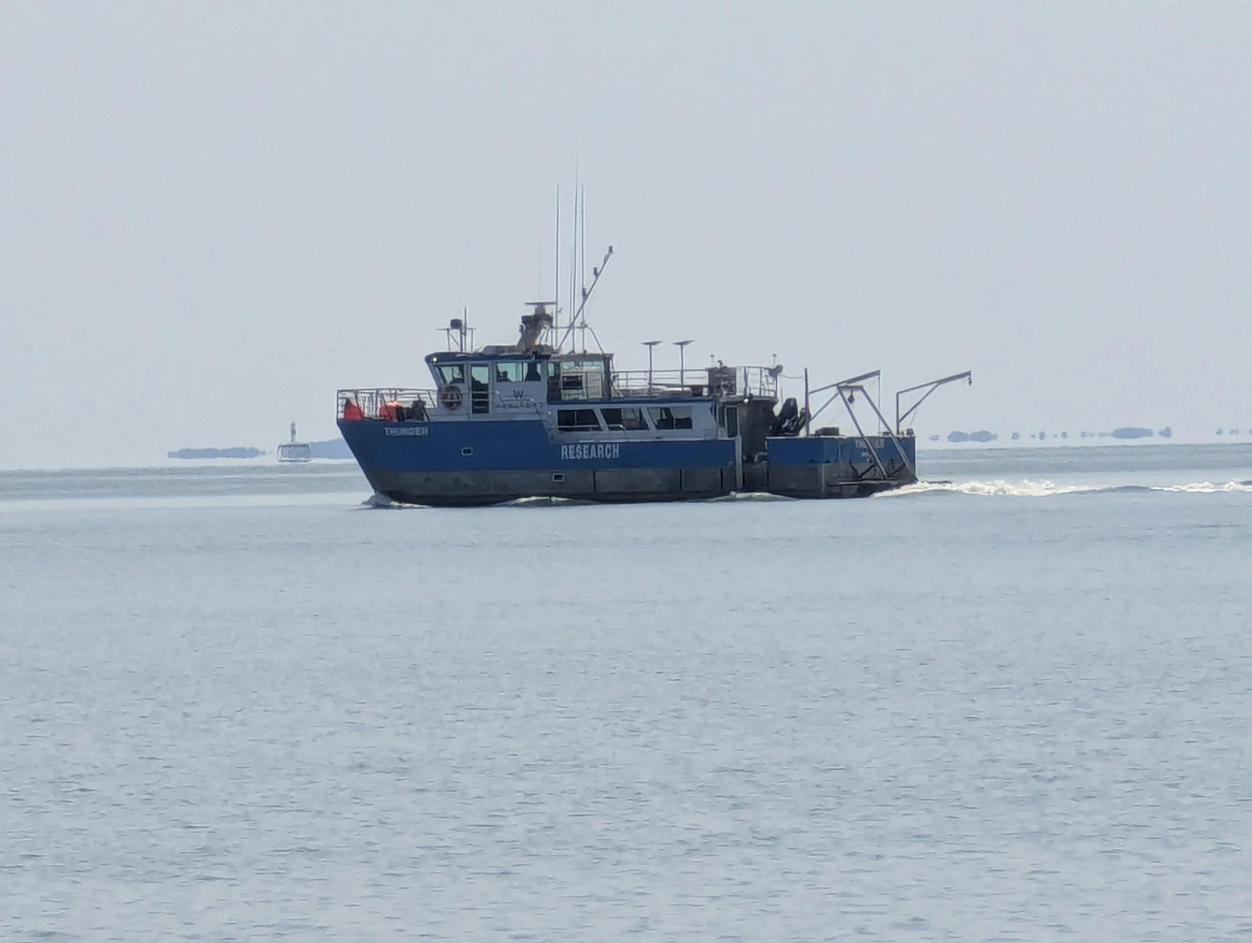 We saw Thunder, a research vessel, going back and forth in our area. We saw it yesterday as well, when we came in. Never quite figured out what it was doing. A quick Google search when we had signal didn't yield any answers. Anchor up at 11:30. Listened to the Liverpool v Brentford game on Sirius FC.