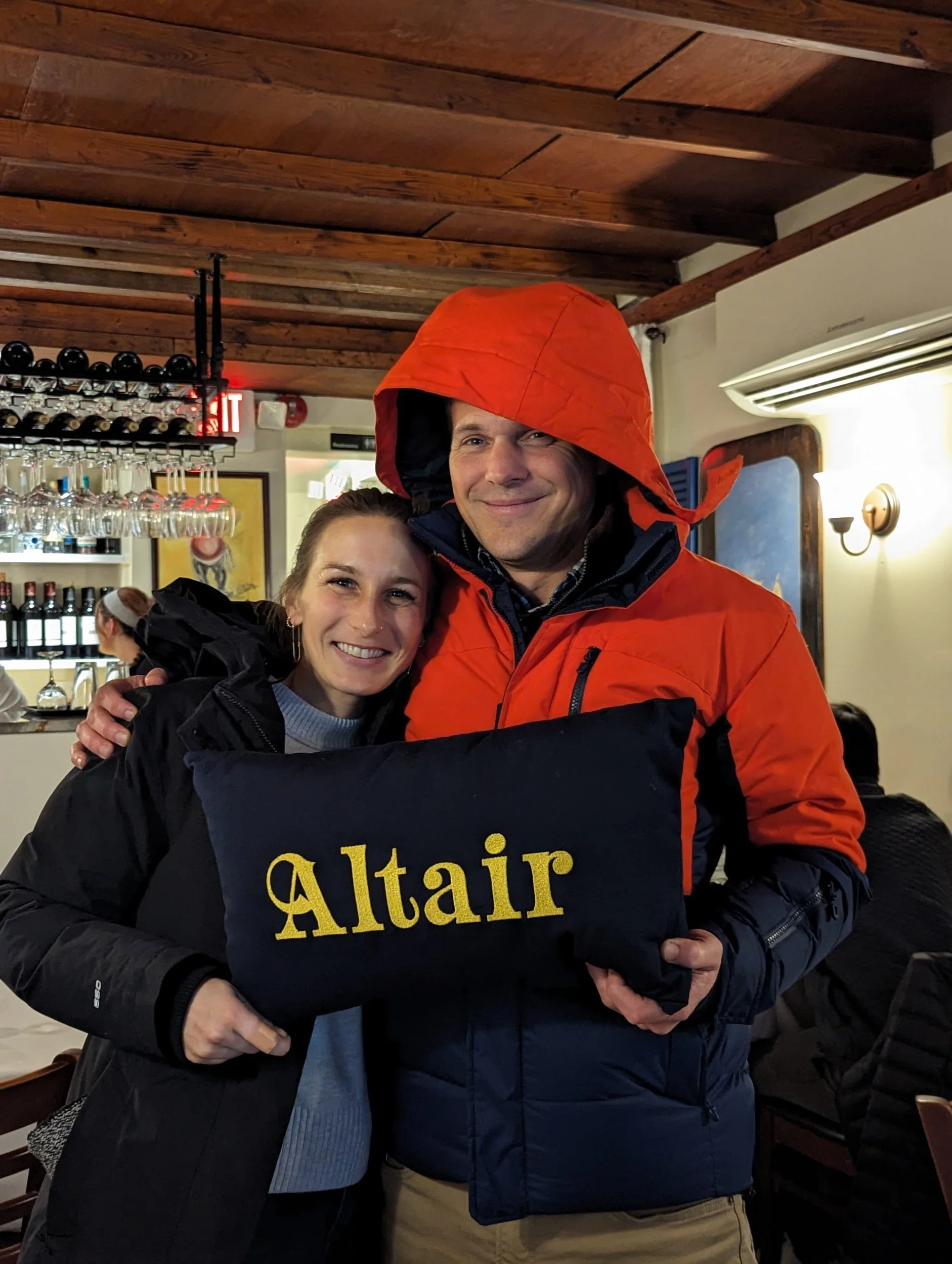 Susan and I in the cockpit. Yes, there is a height difference, always has been. We had a lovely time at Grapes, enjoying a charcuterie of two cheeses, a brie and a Compte, as well as a salami, and a warm goat cheese and fig jam over toasted baguette for our snack. I brought home a lamb Bolognese papparadelle for Laz.