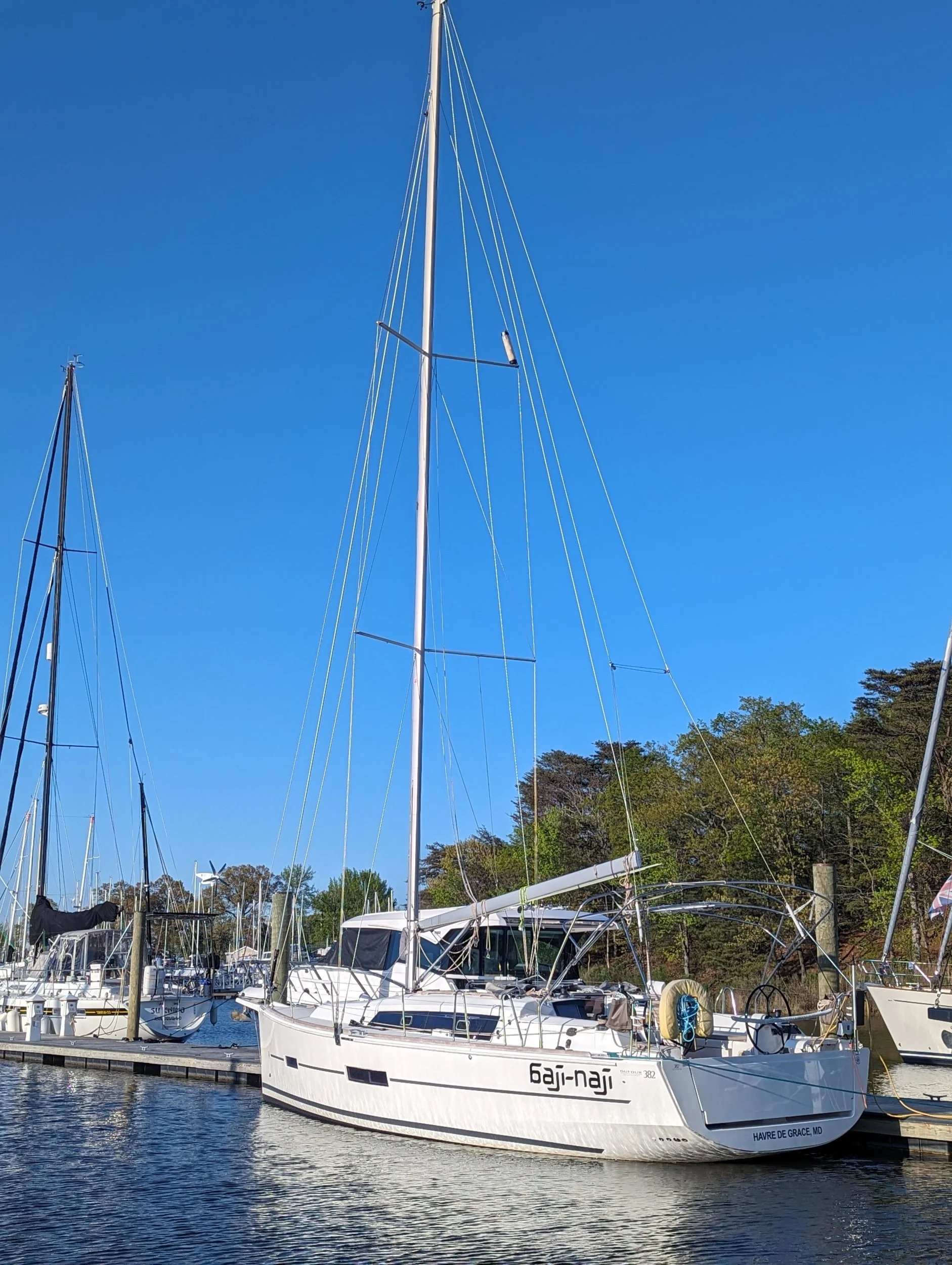 My friend, Susan Bairstow Hebden, whom I've known since first grade, has lived in Annapolis for 30+ years. I haven't seen her in 40+ years, since high school. She was happy to come to the marina, meet Dan, and tour baji-naji. The original plan was to have cocktails aboard, but with Chuck and crew working, and the wind blowing from the sewage treatment plant, we decided to go out to Grapes wine bar, close by. Turns out Susan lives just a few minutes from Jabin's. Laz stayed aboard to watch and learn how the new sail system is put together.
