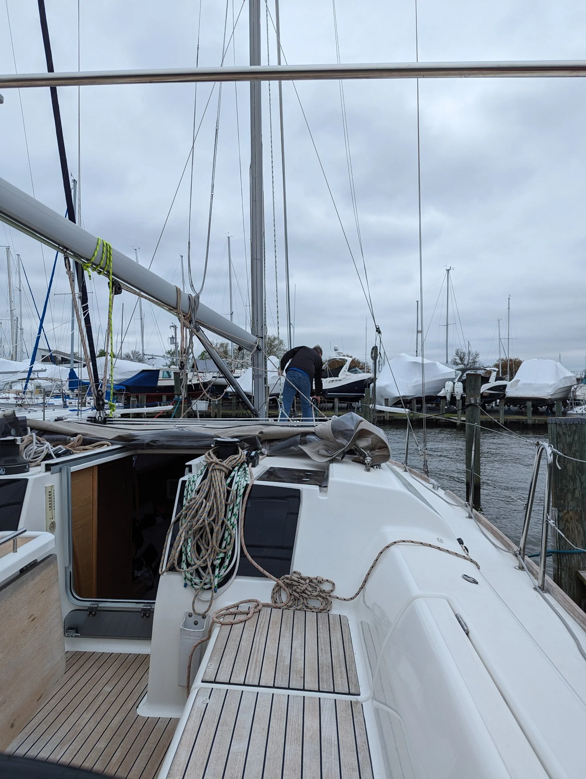 Sadly there was a manufacturing flaw in the storm track making it quite difficult to raise and lower the main. Something in the extrusion pinched the track so it narrows. Chuck ordered a new one, which he will install in HdG, hopefully next week. He has done many of these installs and has never had this happen before. C'est la vie. We can sail her, but the main won't come down easy if we need it to. The bimini was not ready yet either, he will have it for us by 0800 tomorrow. We'll see.