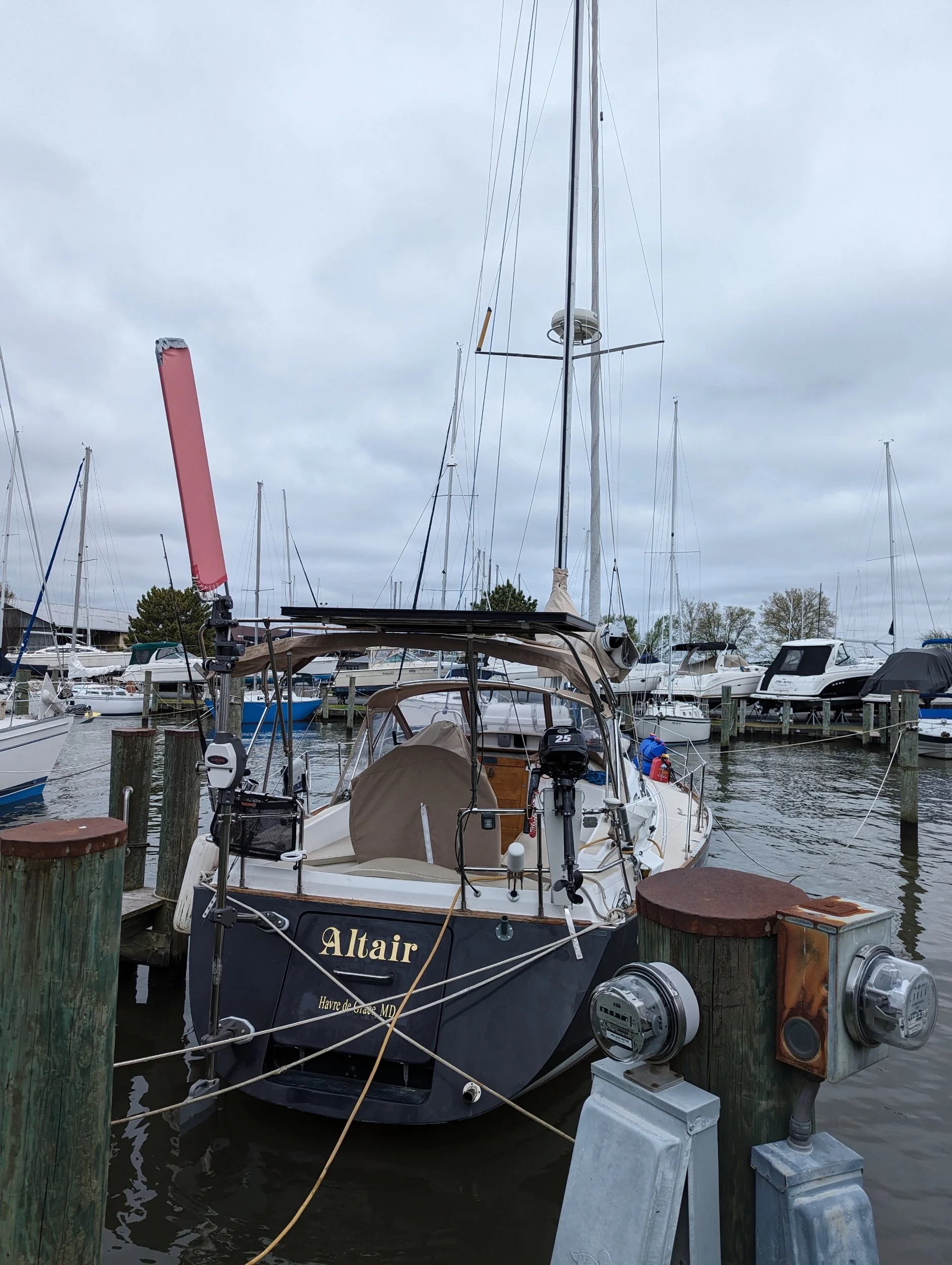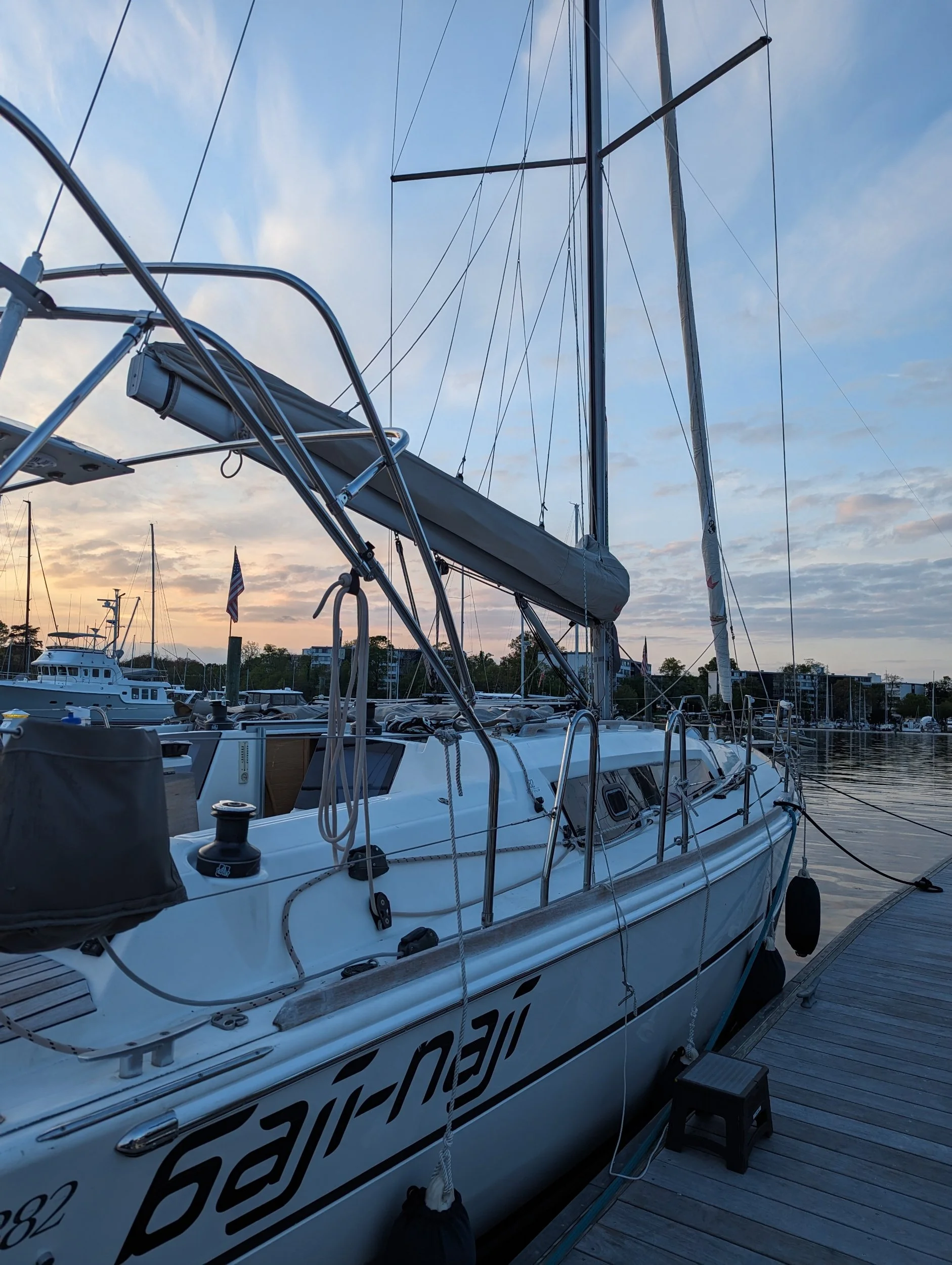 A “before” picture. The after will have her new storm track with sails on, the repaired bimini, the generator serviced and a new rub rail. And the autopilot.