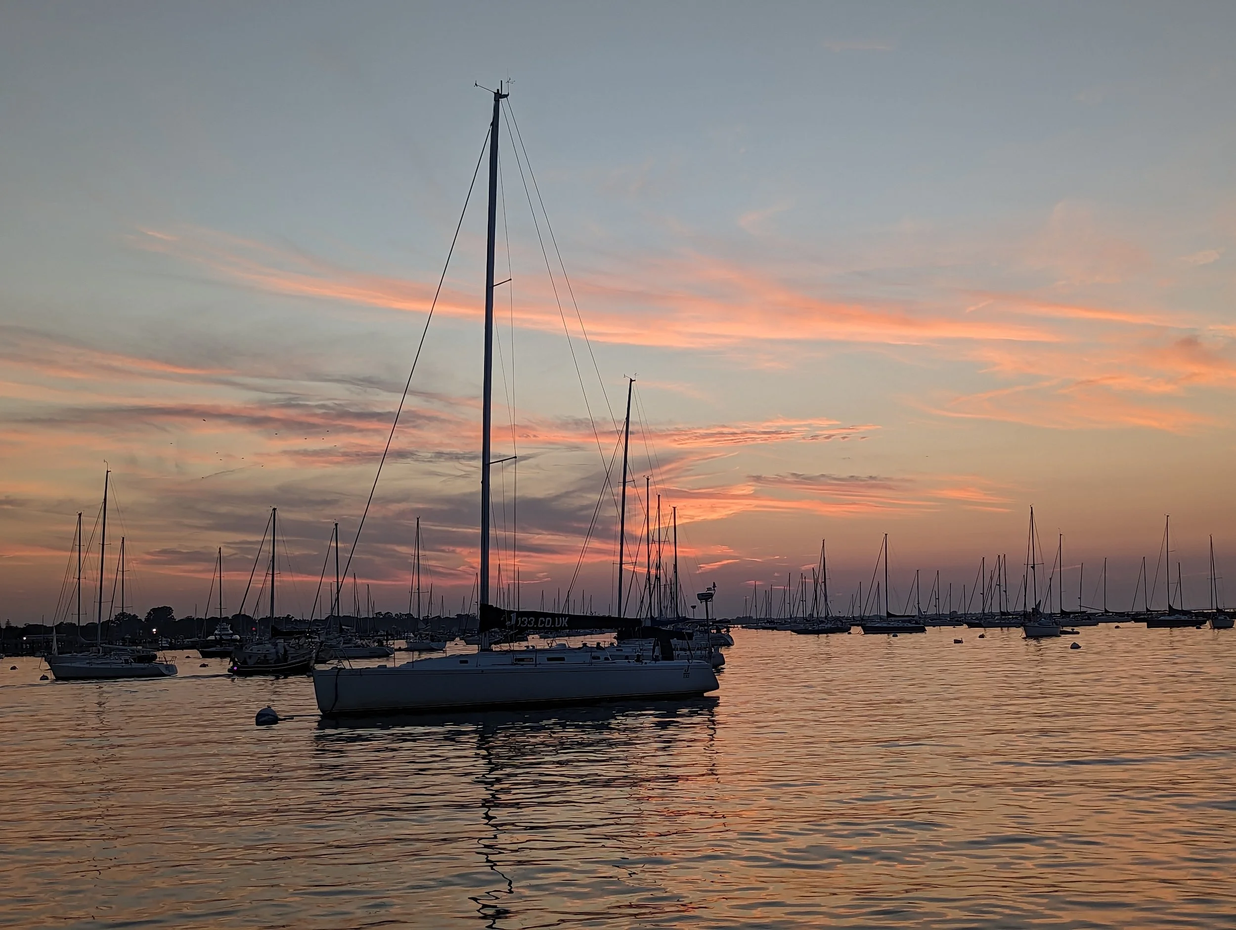 Morning twilight. Gorgeous. We sailed around a bit more, wanting to take the channel in daylight. I made some coffee and brought up the sour cream coffee cake from Isabelle et Vincent. Sun was up around 0600. Took down the sails and landed at the fuel dock just after sunrise at 0700.