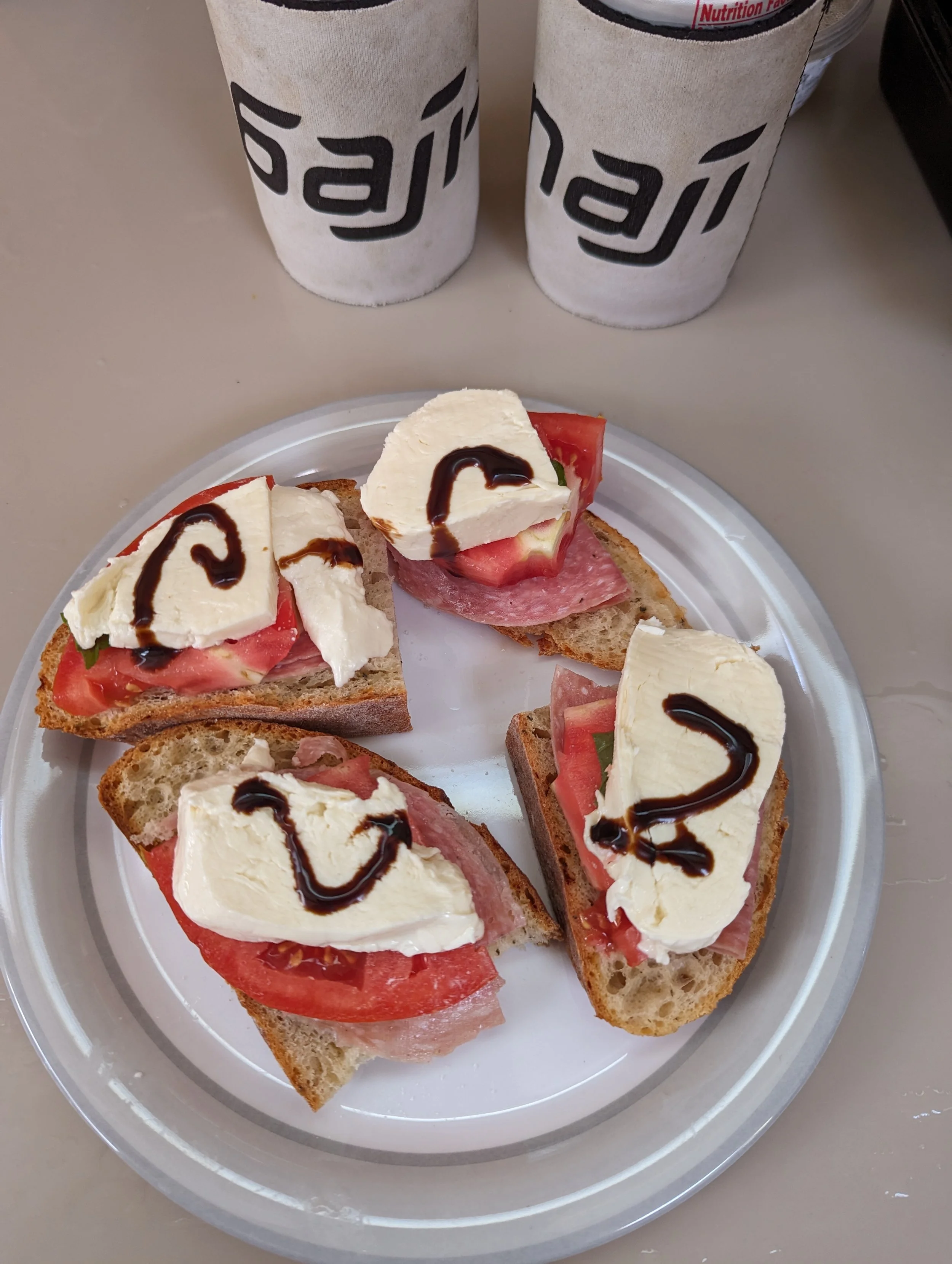 Sat Sept 9 No propane means no way to make coffee. Headed into town to the coffee shop when we ran into the Farmer's market. Got a lovely 1/2 caff pour over from a local roaster. Went to the baker every one raves about and bought a regular and an everything bagel and cheese herb bread. Bought a local fresh mozzarella ball, a smoked cheddar and a ‘seconds’ tomato, basically bruised, so he gave it to me for $1.
