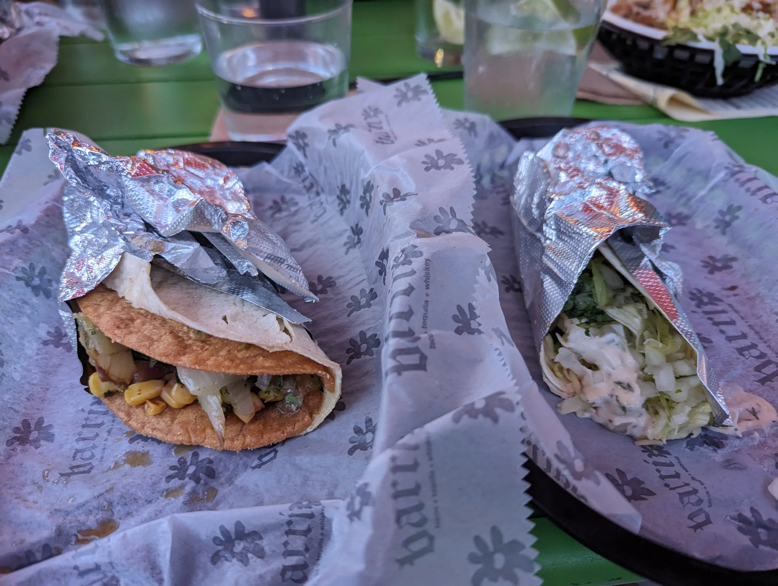 When the gusts hit 20, it was time to furl the jib, drop the main and bring it back to the marina. Went out to a taco place where you could design your own or have their choices. A delicious meal, painfully slow service, but a lovely evening with friends.
