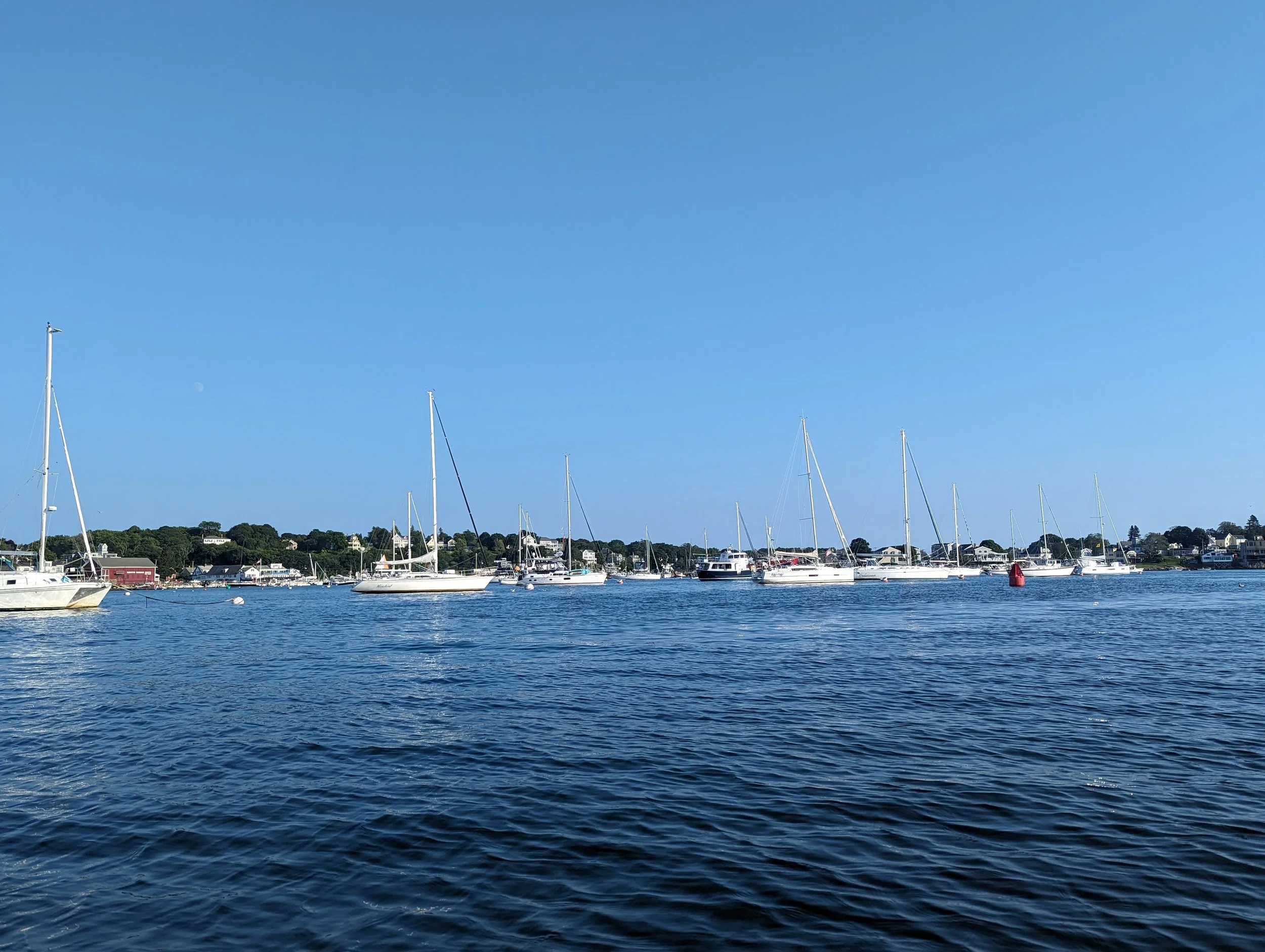 Mon 7/31 Up early to meet our friend Michael Claus for breakfast at 0800 at Island Cafe just a few minutes away. Had a lovely breakfast (breakfast sandwich on biscuit is as good as advertised, crullers are even better) and mocha and then off to show off baji-naji. Michael is a lifelong sailor. Unfortunately schedules for him and his wife Sarah conflicted with our time in Portsmouth so we were unable to take him out for a day sail. We used the courtesy car to take Laz for a haircut, stop at Westmarine for charts and a better guidebook of the New England Coast. Got a new fan just in case either of the current ones fail, and some Starbrite non-skid cleaner and protector. Stopped at La Mulita for me to get coffee, medium roast and decaf as my Waterman's Blend is nearly gone. Back to baji-naji where we did 2 loads of laundry (had to download and app and left $ on the app). Laz cleaned Boji's bottom and scraped all the baby barnacles off. We then cleaned the deck with the Starbrite. Pretty sure I didn't do it as the directions said but it was done. Our friends Bill and Susan McClure, who live in Portsmouth, were returning home from Cape Cod and came over around 3p and were thrilled to go for a daysail. Bill has sailed, Susan has not. We had a great sail, with everything from minimal breeze of 3-4 kts, an awesome 15 kts where we were going nearly 7kts, up to gusts of 20kts as a cell moved in with some sprinkles of rain, all in 2 1/2 hours.