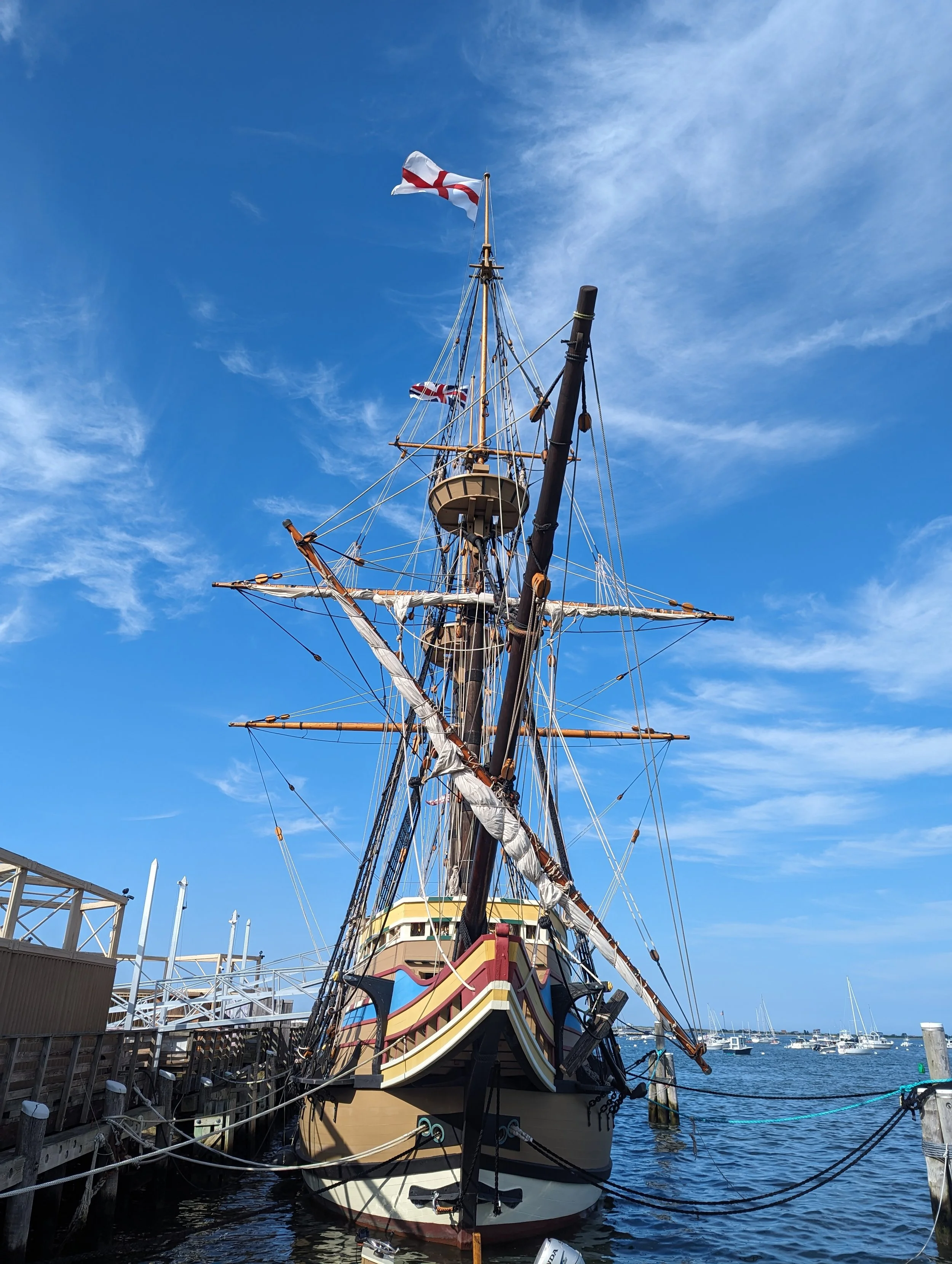 It is the summer of Tall ships for us. Also in Plymouth Harbor is the Nao Trinidad, a Spanish ship, built as a replica. She sailed from Spain in 2018 and is doing her US tour