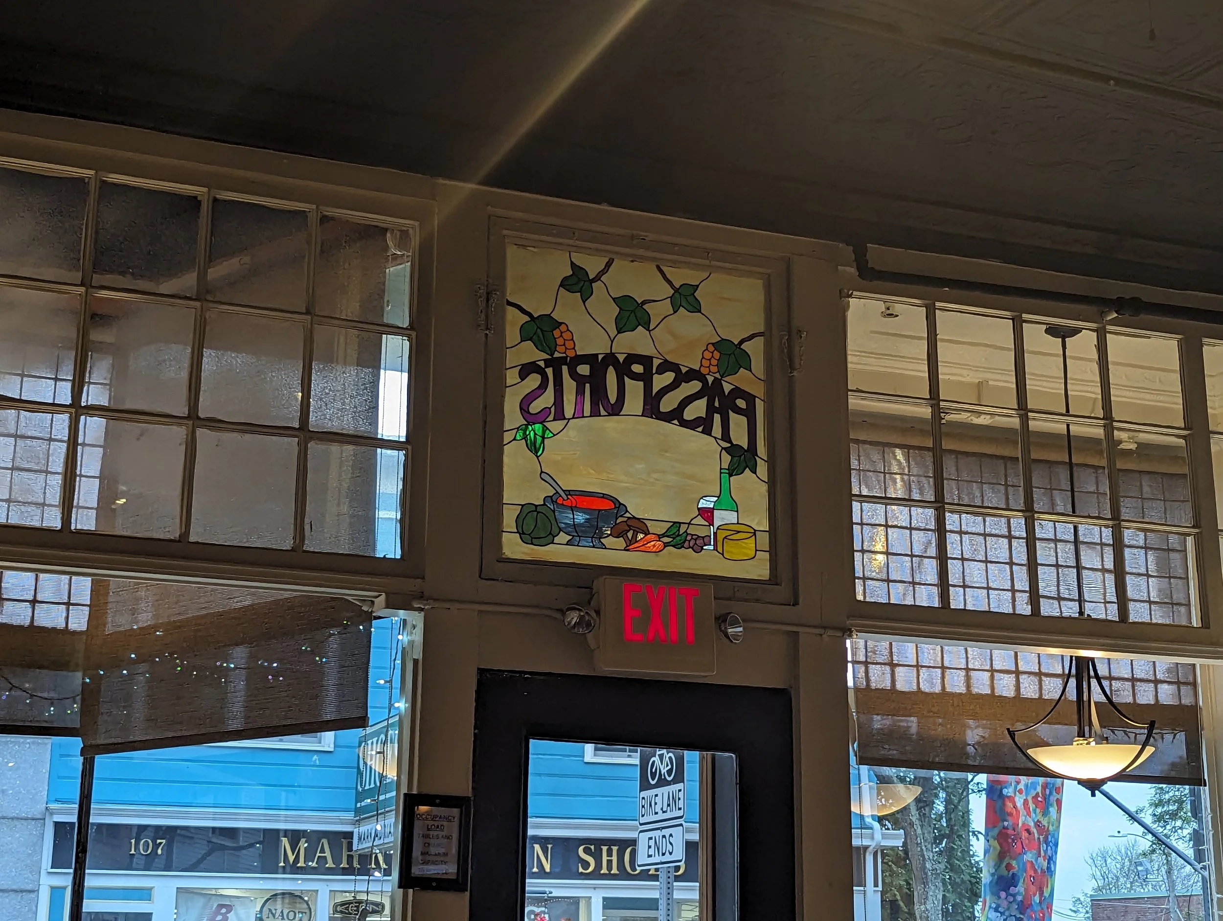 Headed into town on the launch to eat at Passports again. I did not notice the beautiful stained glass until we were seated