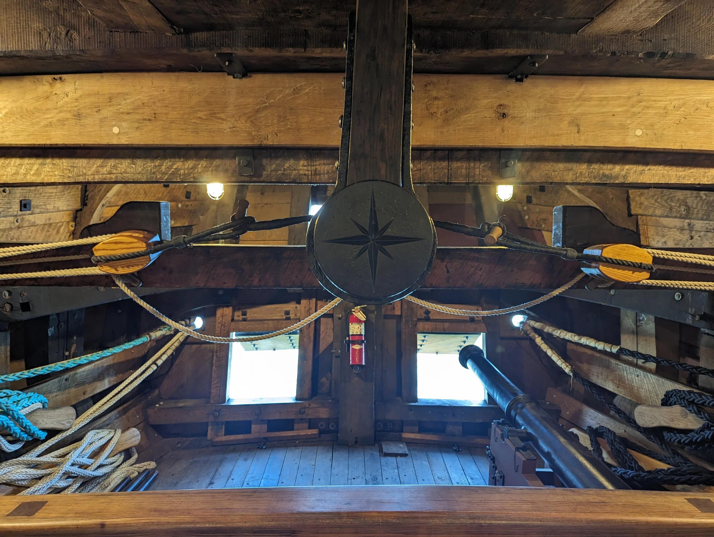Looking up from the bow. They have not been able to sail her for 3 years, even though she is seaworthy. Partly due to the pandemic and partly because it is expensive to sail her. The Captain would love to have her out again, as would the docents, many of whom have not sailed on her.